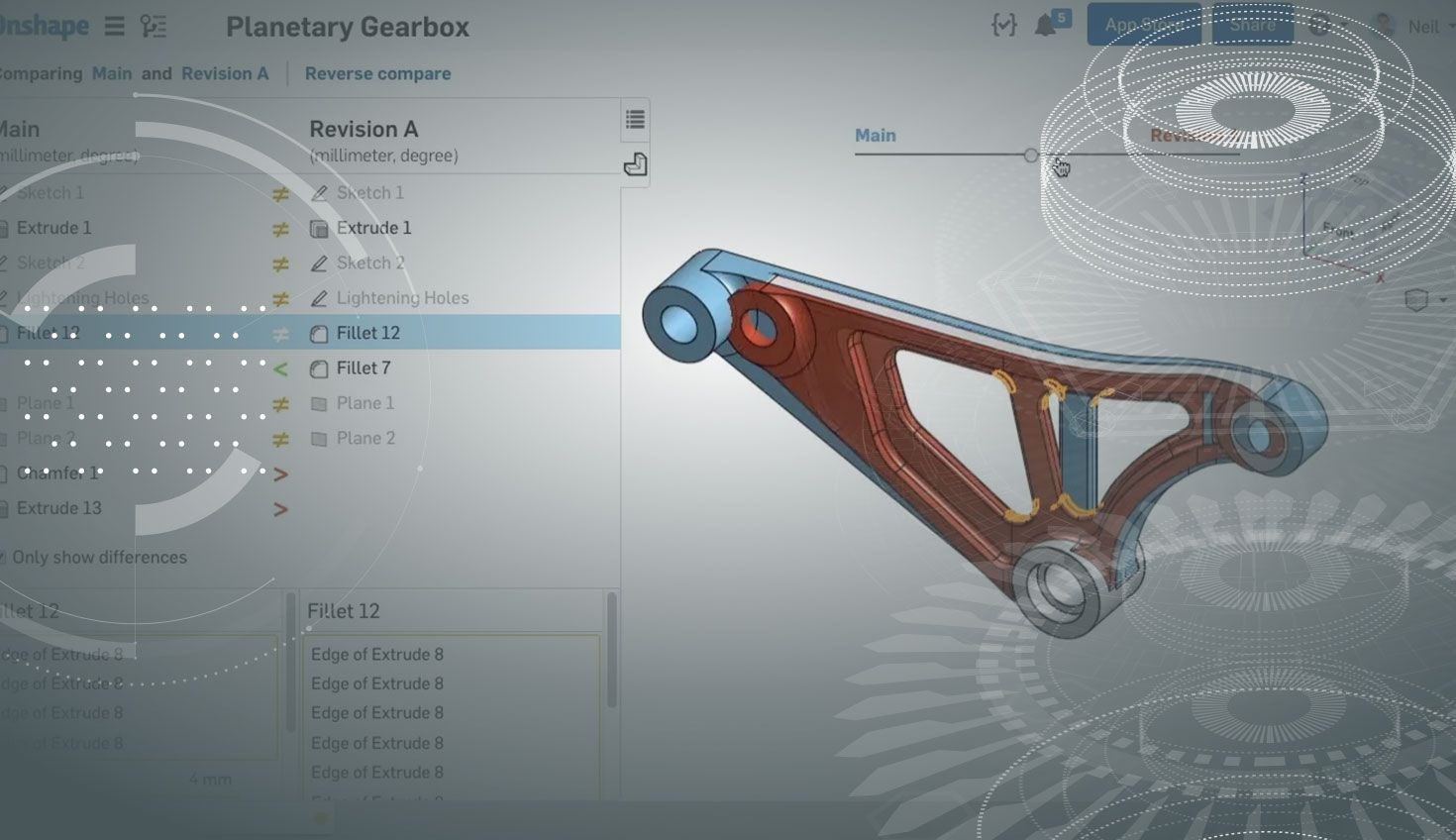 Executives can not only get an immediate progress update from their employees, but also monitor the activities of their contractors and vendors, too. Looking at Onshape’s complete Edit History, managers can see every change to the model (adding a fillet, moving an assembly, deleting a part, etc.) and know who made which edit and when.