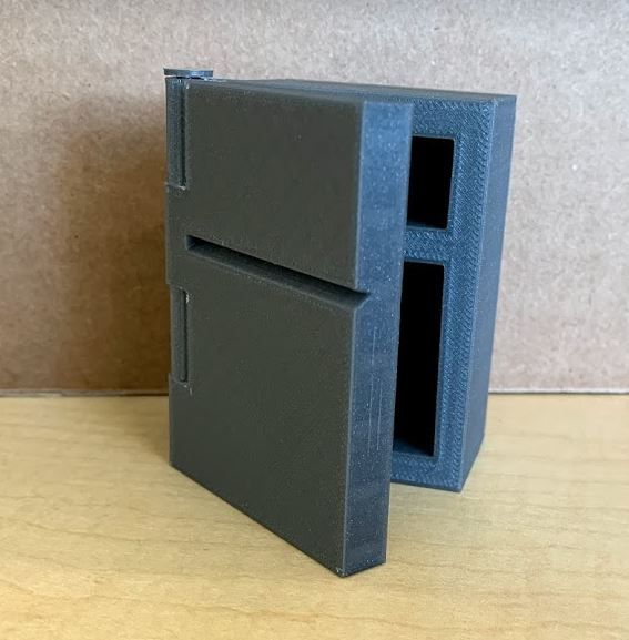 A student designed this mini fridge with a hinged door that opens and closes.