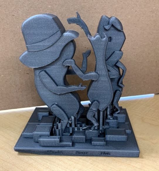 A trio of dancing figures on a textured platform by one of Kutz’s students