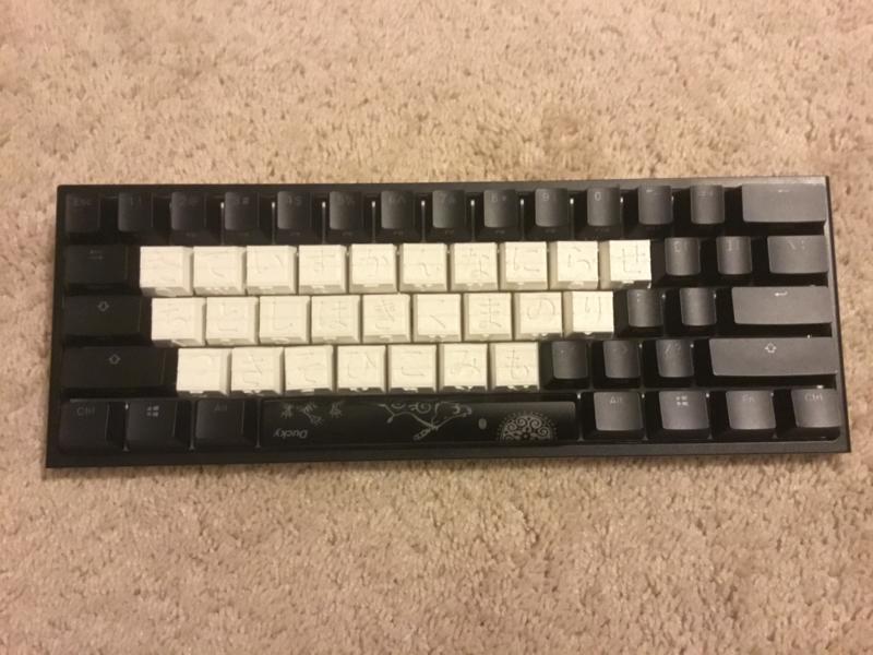 He now uses his computer with a full set of keycaps with the Japanese characters on top and the English characters on the sides.