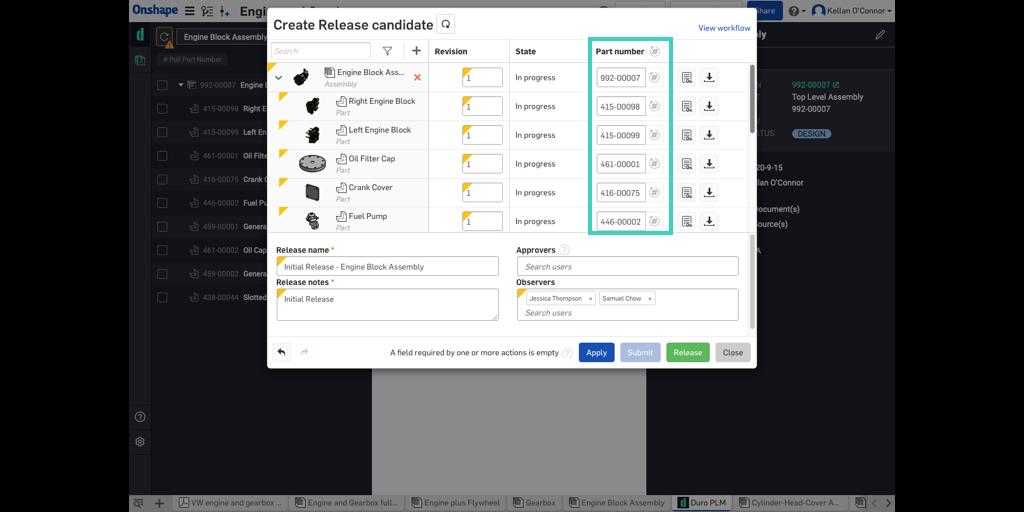 Onshape users can now leverage the benefits that PLM-based Part Numbering best practices bring, including reducing CAD merge issues, preventing conflicts with external part numbers, and navigating multiple Bills of Materials (see Duro’s step-by-step guide for centralizing your Part Numbering System). Duro’s category-driven part numbering scheme allows all company members to run parametrically-based searches for product-related information created in Onshape or any other integrated application. Duro’s automated data validation engine can even scan your parts and assemblies for the most common mistakes that frequently lead to manufacturing delays.
