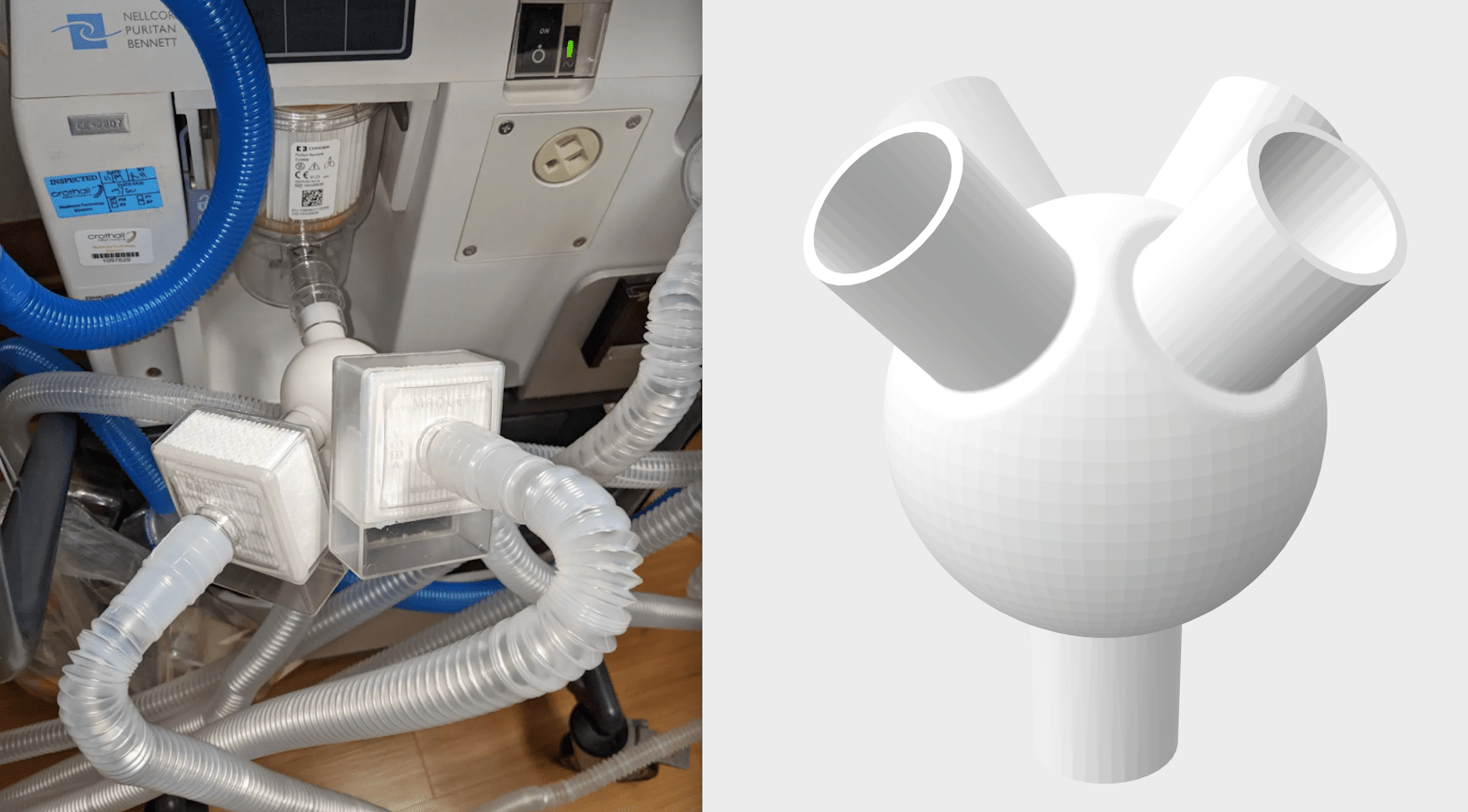 The Ventilator Quad Splitter was designed as a last resort in a catastrophic scenario where there are many more patients than breathing machines. (Image courtesy of Interactive CAD Solutions)