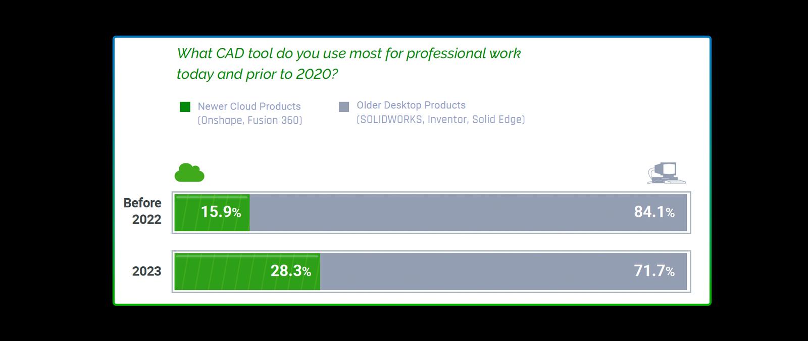 Nearly a quarter of The State of Product Development respondents expect to change CAD systems in the next 5 years. CAD vendors – the companies behind Onshape, SOLIDWORKS, Fusion 360, and more – are increasingly focused on cloud offerings over desktop or on-premises software. However, cloud offerings differ among CAD vendors – some are cloud-native, while others utilize cloud-hybrid models.
