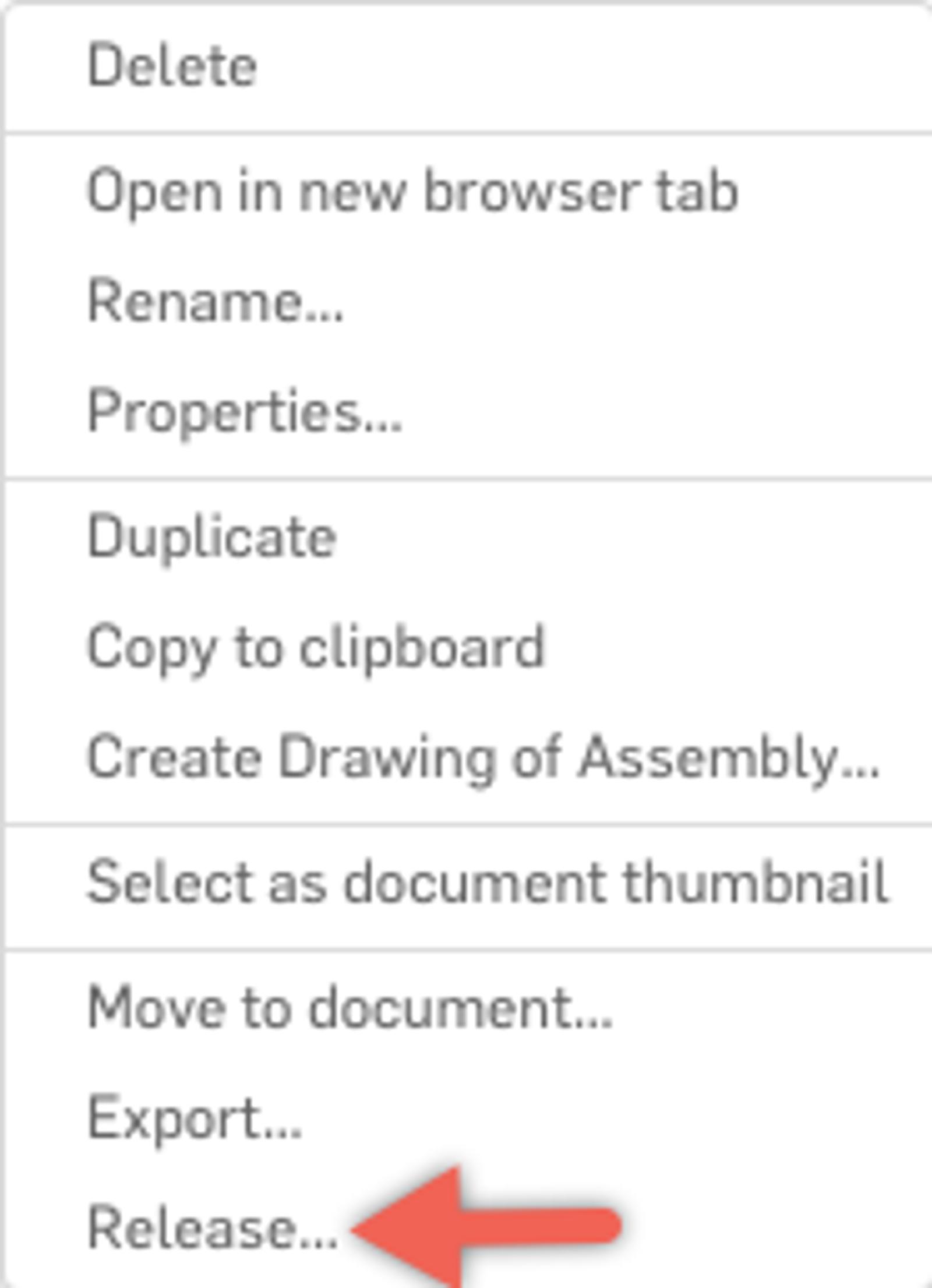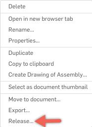 A great example is creating a Release Candidate, which is a specific version of a design that is being considered for release or approval. In Onshape, you right-click on whatever you want to release, and the option “Release” will appear in the menu.