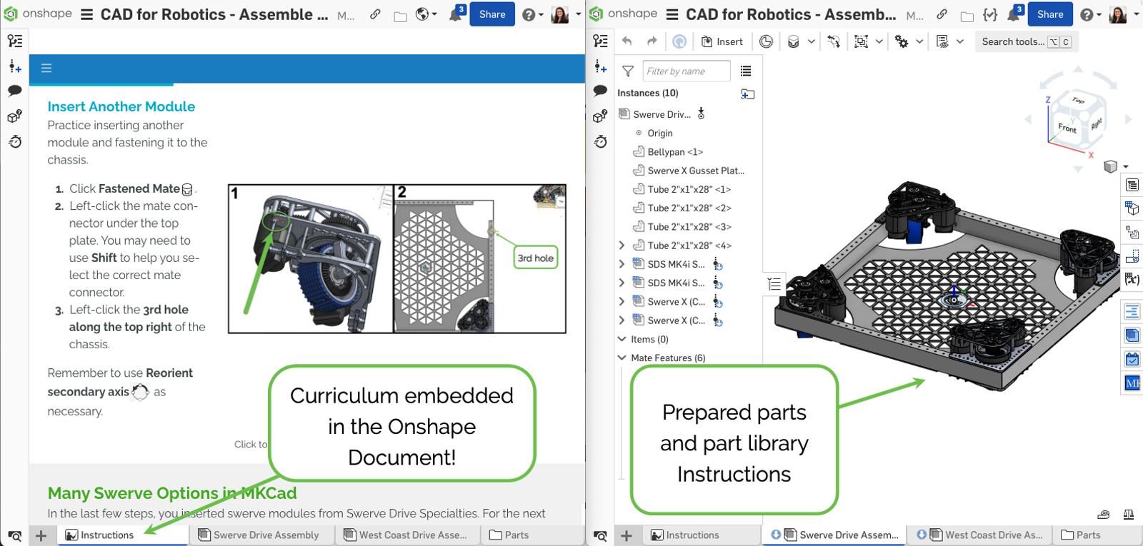 This curriculum largely lives inside Onshape Documents. We wanted to put the instructions right where the action happens. The first tab within any of the Onshape Documents will contain all instructions for completing the lessons. We recommend providing students with a secondary monitor or showing students how to split screens to make the most of the learning time.