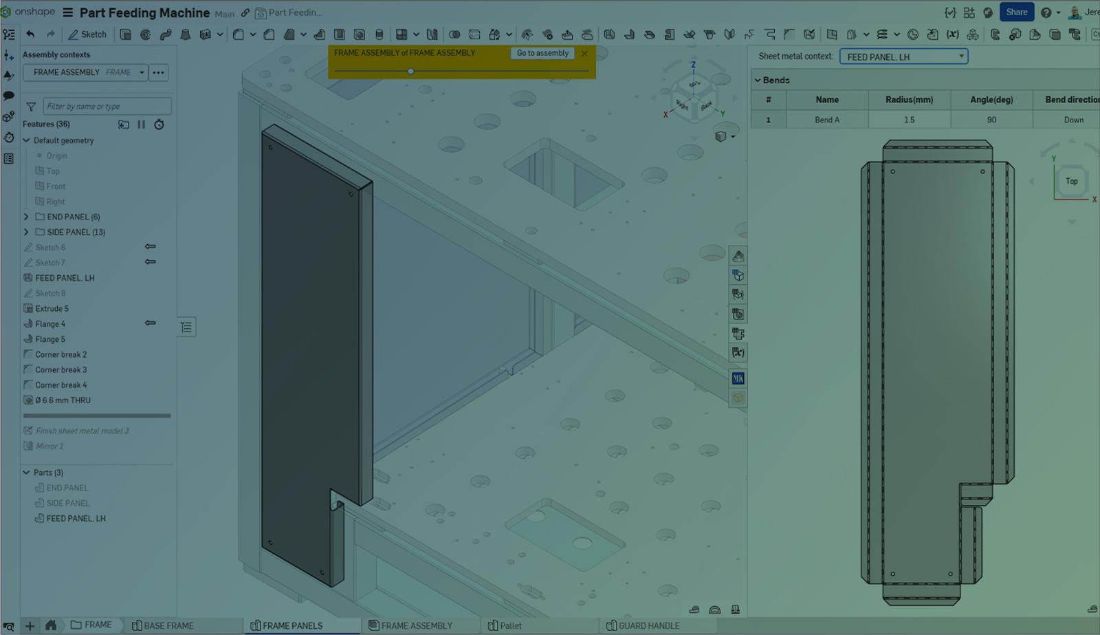 When designing sheet metal components, manufacturability is critical. Onshape’s sheet metal design tools are unique in that they allow you to simultaneously design in both the formed and flattened states.