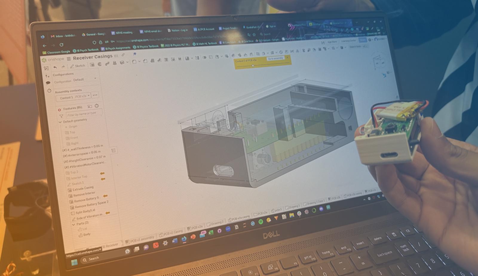 Their prototype mainly included 3D-printed parts designed in Onshape. The students emphasized that they went through many iterations of the design and prototype prints and that Onshape made it easy to change and develop the parts as they went along.
