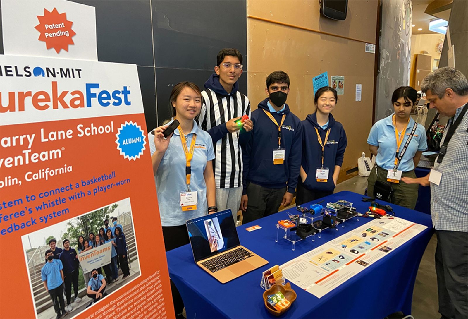 The Quarry Lane School (QLS) InvenTeam is an alumni team that brought along a new version of their invention from last year. Driven by their shared passion for engineering and sports, they developed a device to help improve in-game communication for athletes with hearing loss.