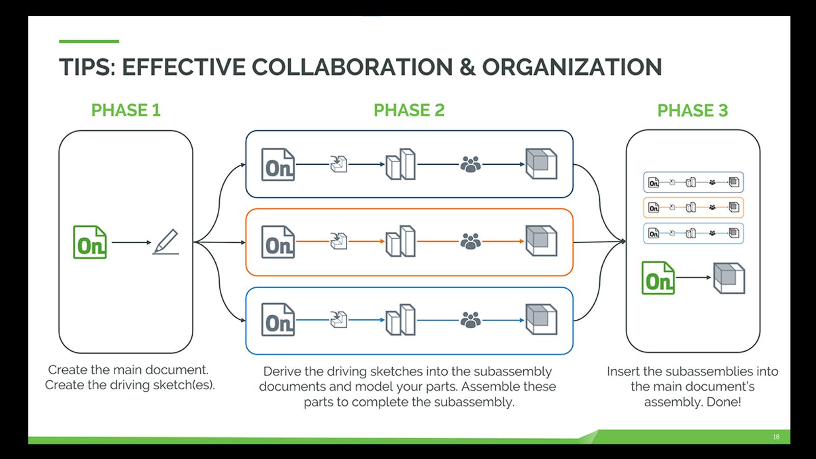 One strategy for managing your project that FRC Team 1678 uses for top-down design is to start with a main document and create initial driving sketches of important geometry. Then when that initial design is reviewed, they derive those driving sketches into new subassembly documents. In those documents, they then model parts and make the subassembly. Changes to the main document driving sketches can propagate to these parts because they reference the derived master sketches. Lastly, they assemble the subassemblies back in that main document. This is definitely a little hard to conceptualize, so watch the session recording to learn more.