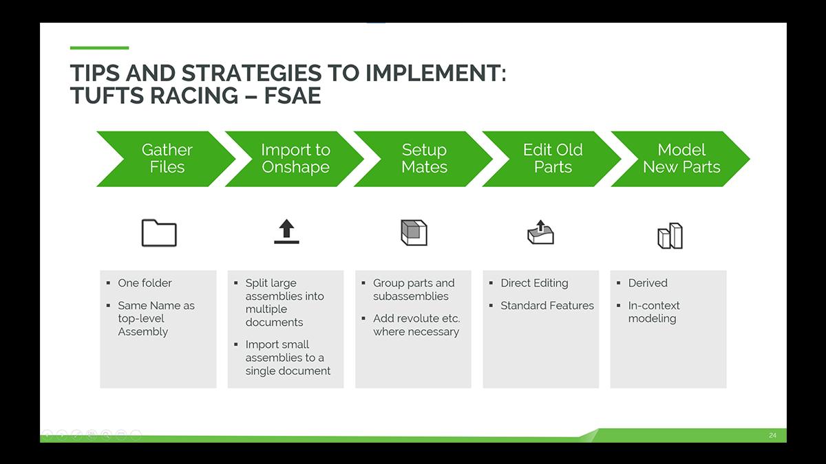 A team that I work with closely is Tufts University’s Formula Electric Racing Team. They recently switched to Onshape after using another tool for years. Over the previous year, they had been working on a new design for their car based on their old chassis, so they wanted to be sure that they could keep building off their work.
