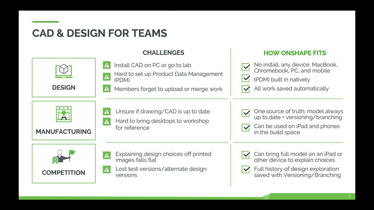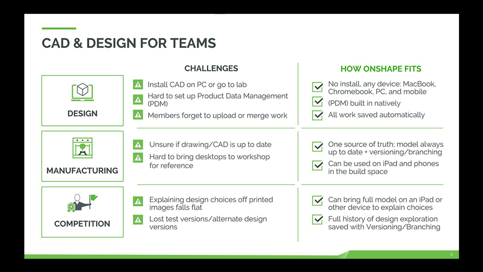 In this session, Drew Bennett and I, PTC Education engineers that have been part of and mentored teams, talk about the benefits we see for teams switching to Onshape, tips for modeling success, and some of the resources for teams getting started or wanting to improve their CAD processes.