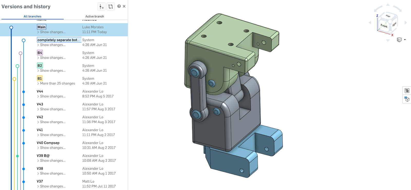While all of the initial founding members of Koi Prosthetics have graduated from Brown, many (including myself) are still actively working on the designs. Onshape has proven to be invaluable for keeping our dispersed team on the same page whenever there are design improvements or new challenges. Anyone can look at the edit history and see who did what and when — or even revert to an earlier version of the design and start a new branch to explore alternative ideas.