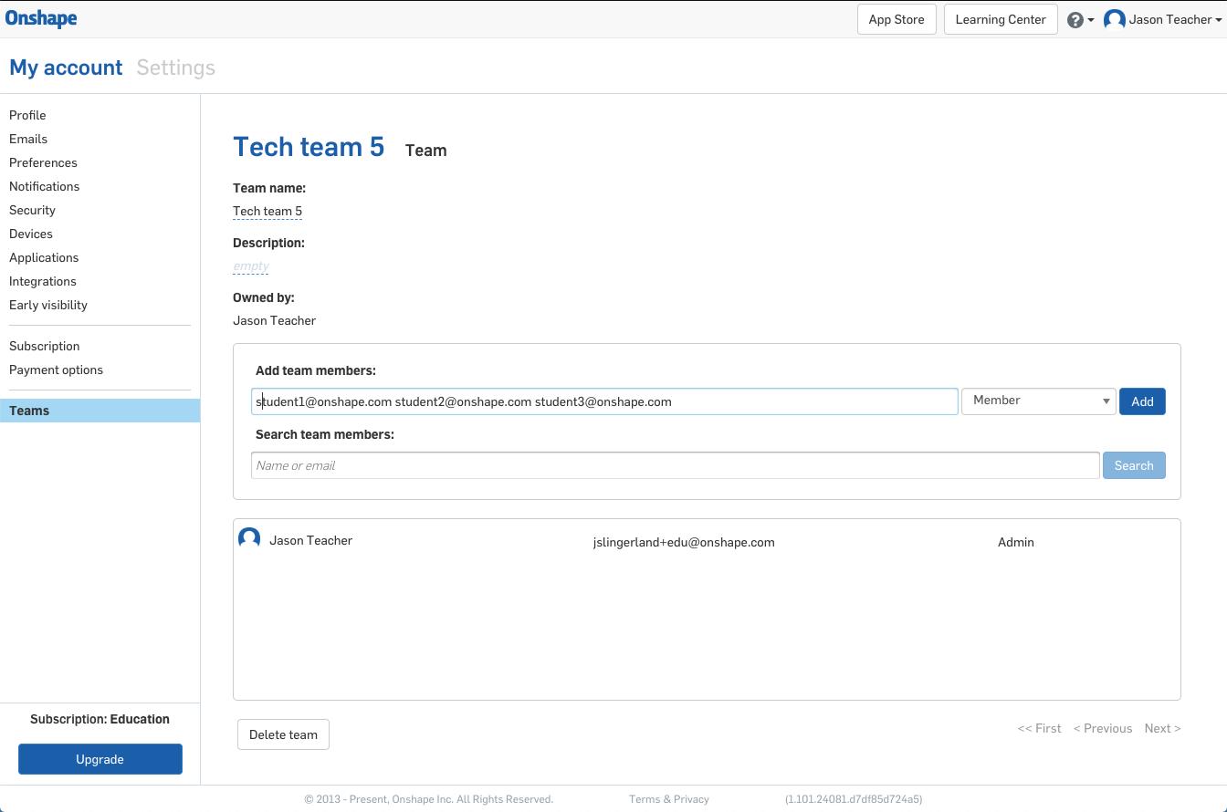 Next, you’ll need to add your students into Onshape by creating a “team.”