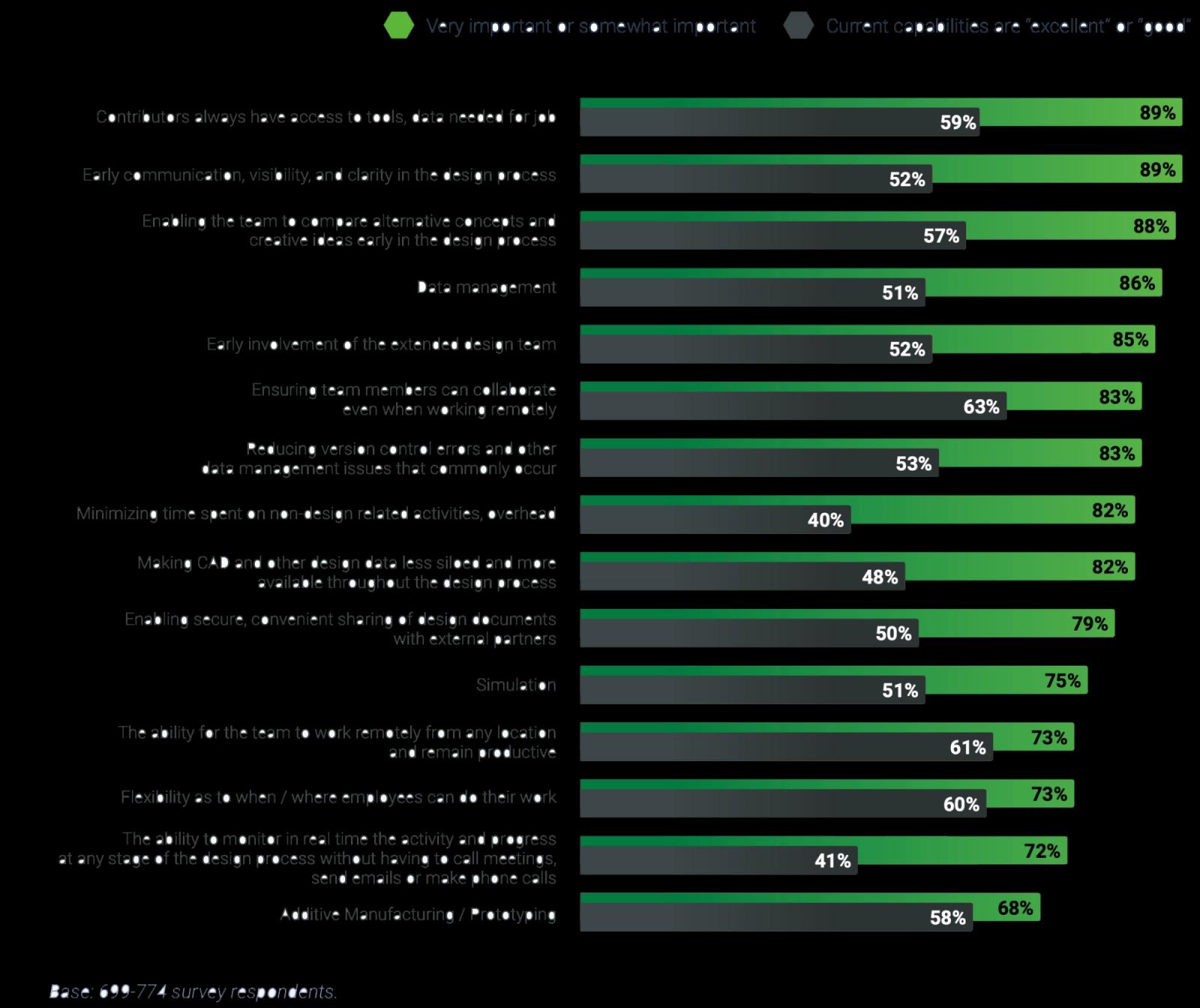 In nearly every identified priority area, companies report they are falling short of where they know they need to be. This pattern of dissatisfaction is consistent across product development processes and design tools/technologies. No one gave themselves and their colleagues a perfect score.