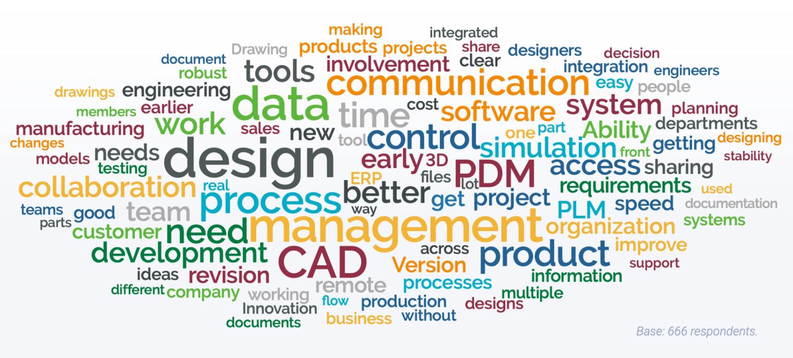 The larger the word appears in the cloud, the more frequently it was selected as an area for desired improvement. Note that critical process areas – such as communication, collaboration, access and management – are mentioned as problem areas as often as design tools and technology (CAD, PDM, PLM).