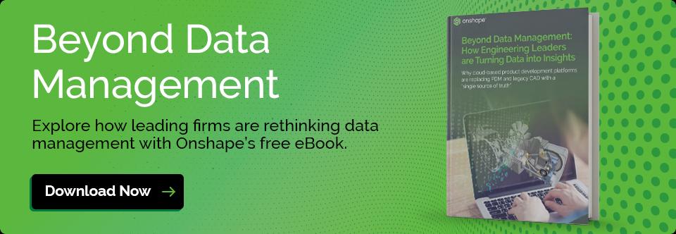 In Onshape’s eBook, “Beyond Data Management, How Engineering Leaders are Turning Data into Insights,” we explore how leading firms are rethinking data management in order to empower employees, streamline processes and ensure accelerated time to market.