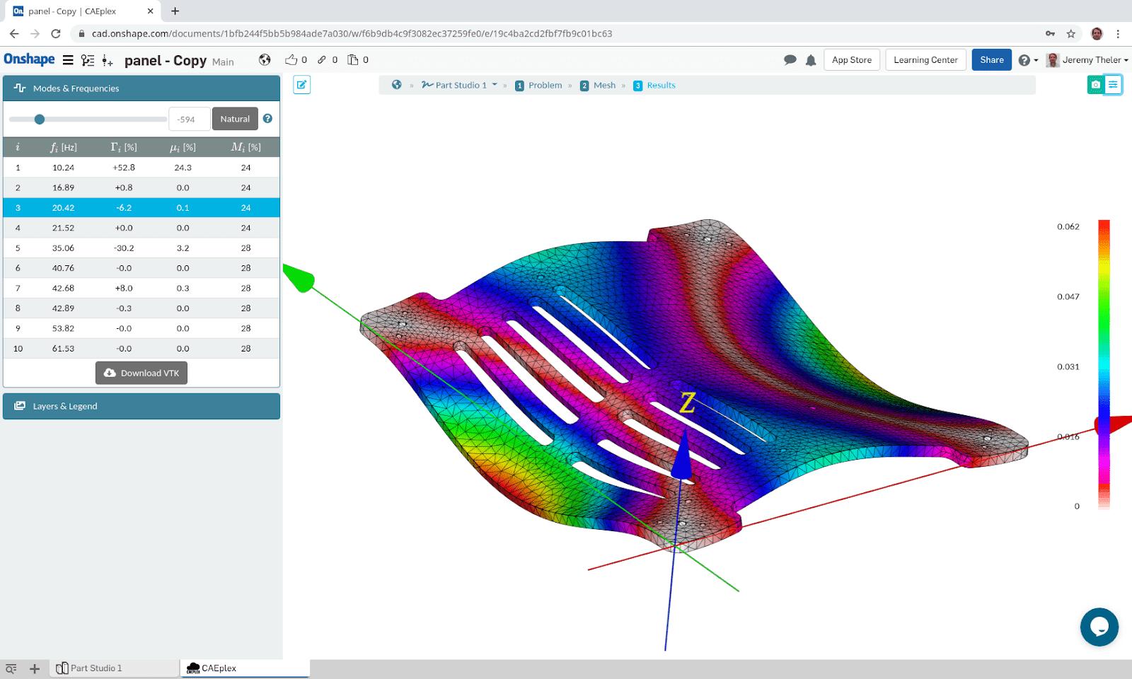 The third natural oscillation mode of a panel fixed on the corner holes. The table on the left shows the frequencies and modal masses of the first ten modes.