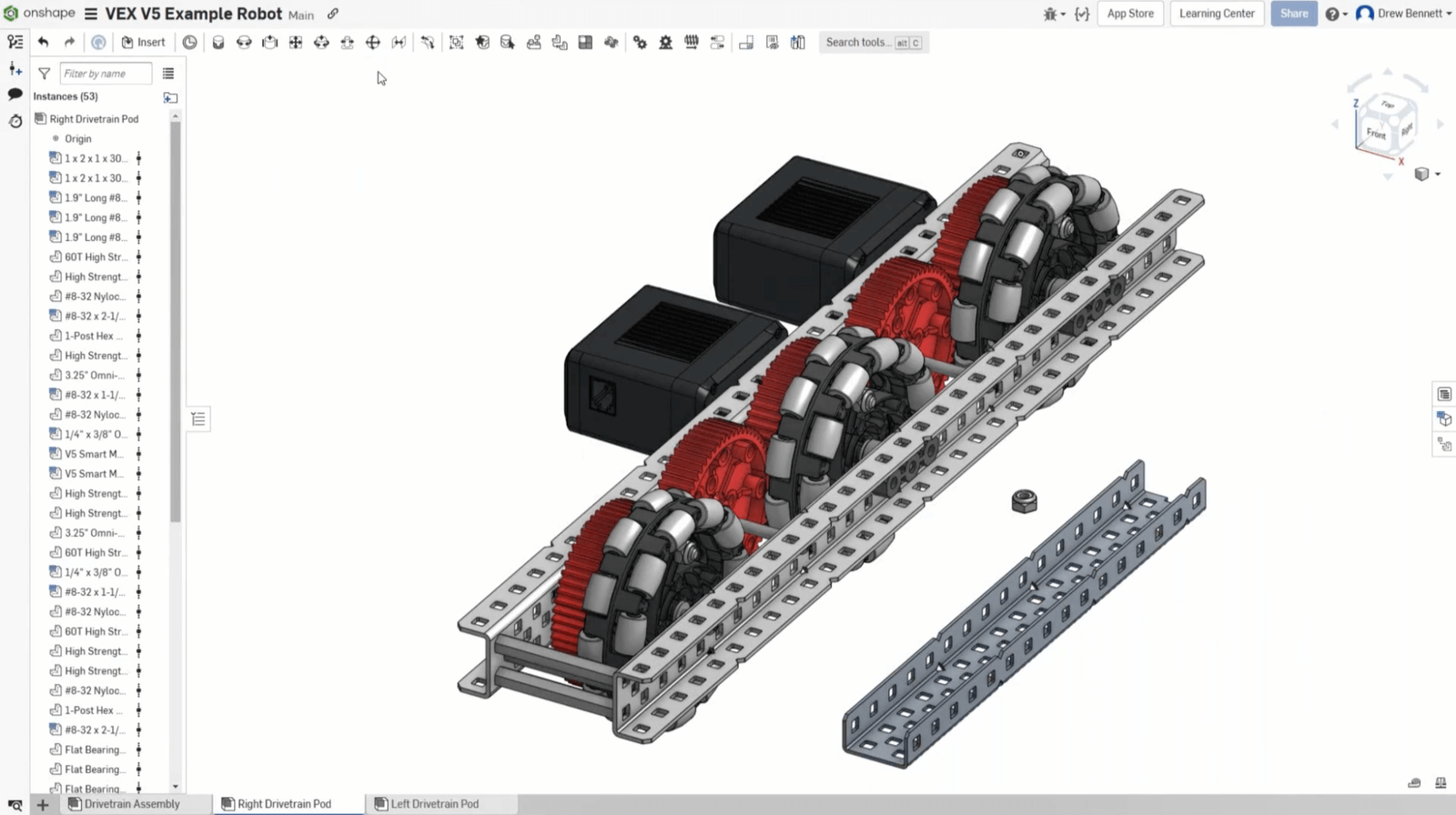 You can use Onshape, a professional-level CAD that lives in the cloud, and the VEX Robotics V5 Parts models to explore different builds, test your designs, and communicate improvements.