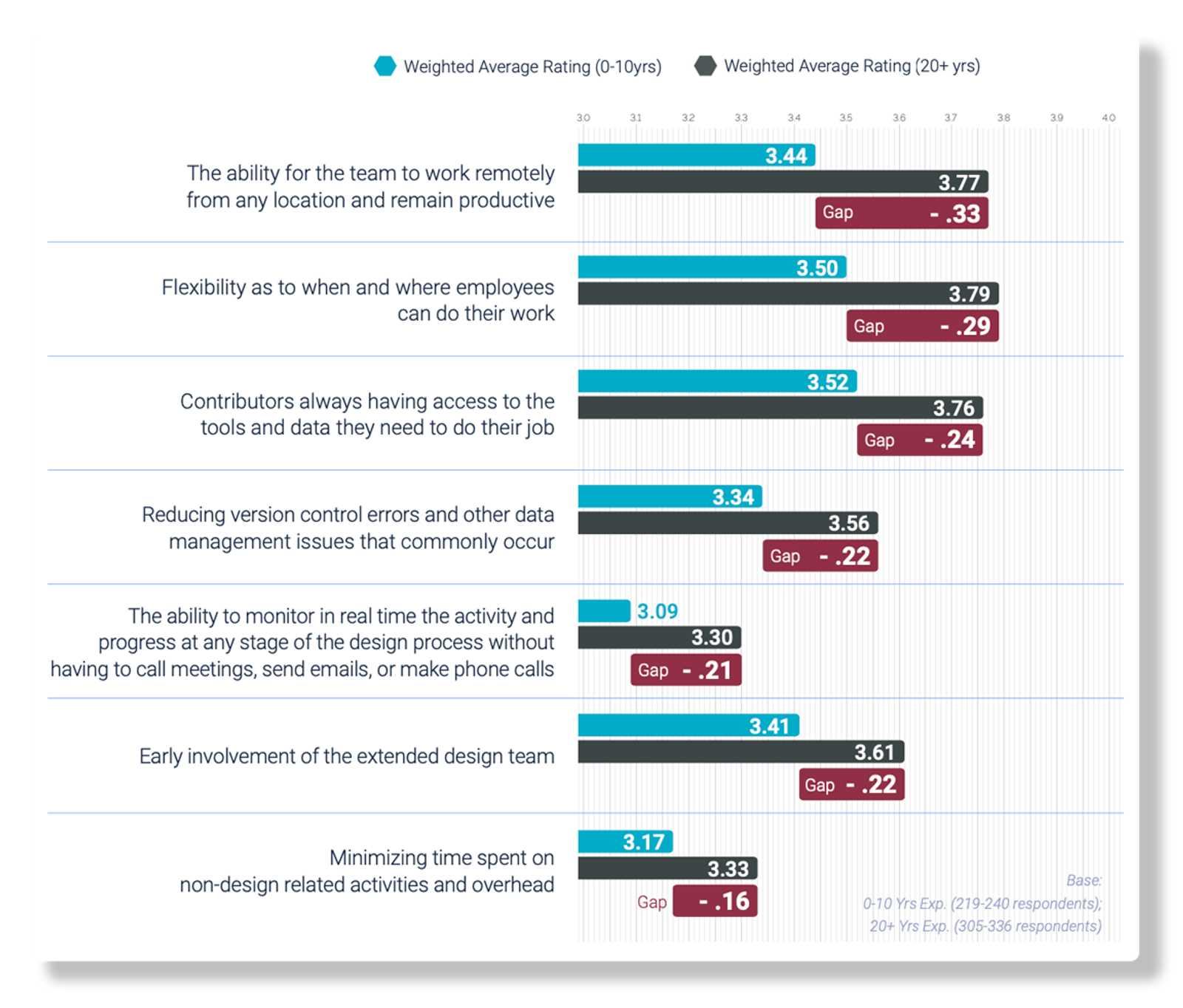 - The top areas of concern for Generation Z and millennial engineers were focused on: workplace flexibility, team communication and the technological limitations of current design tools.