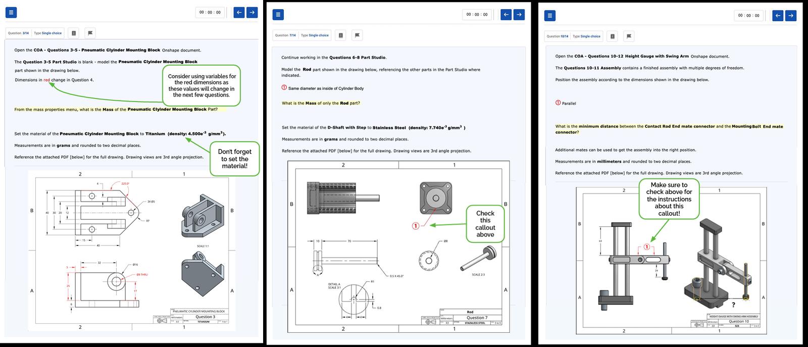 Second, a full practice exam is provided in a separate document that shows the layout and user interface. It contains a complete set of practice drawings and links to Onshape documents to hone your modeling skills. The practice exam also includes single-choice practice questions at the end, rounding out the full exam experience.