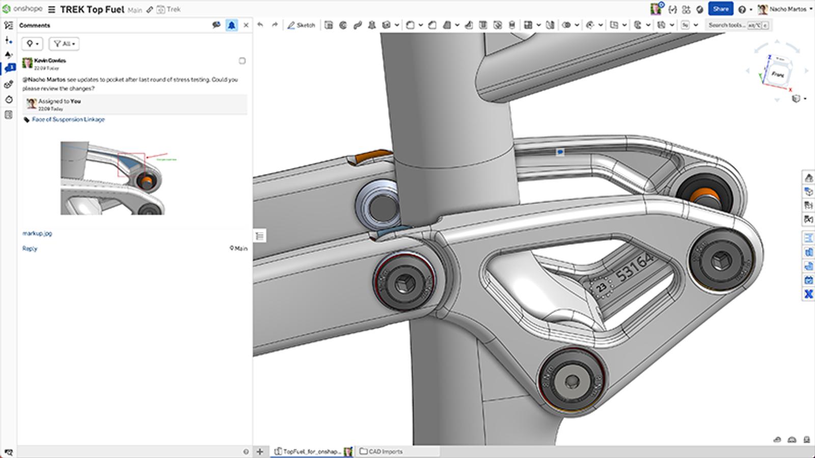 “Everything is moving to cloud collaboration,” says Brian Johnson, Engineering Manager at Trek. “Your Onshape models are always live. There’s no risk of sending an old file to a supplier. There's no risk of someone picking up an outdated model and working with it because everything you get in Onshape is live.”