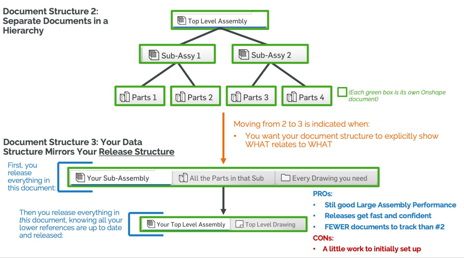 New users coming from file-based CAD systems often ask this question because Onshape’s cloud-native architecture allows users the freedom to arrange data in a multitude of ways. However, depending on what should be optimized, some data structures work better than others.