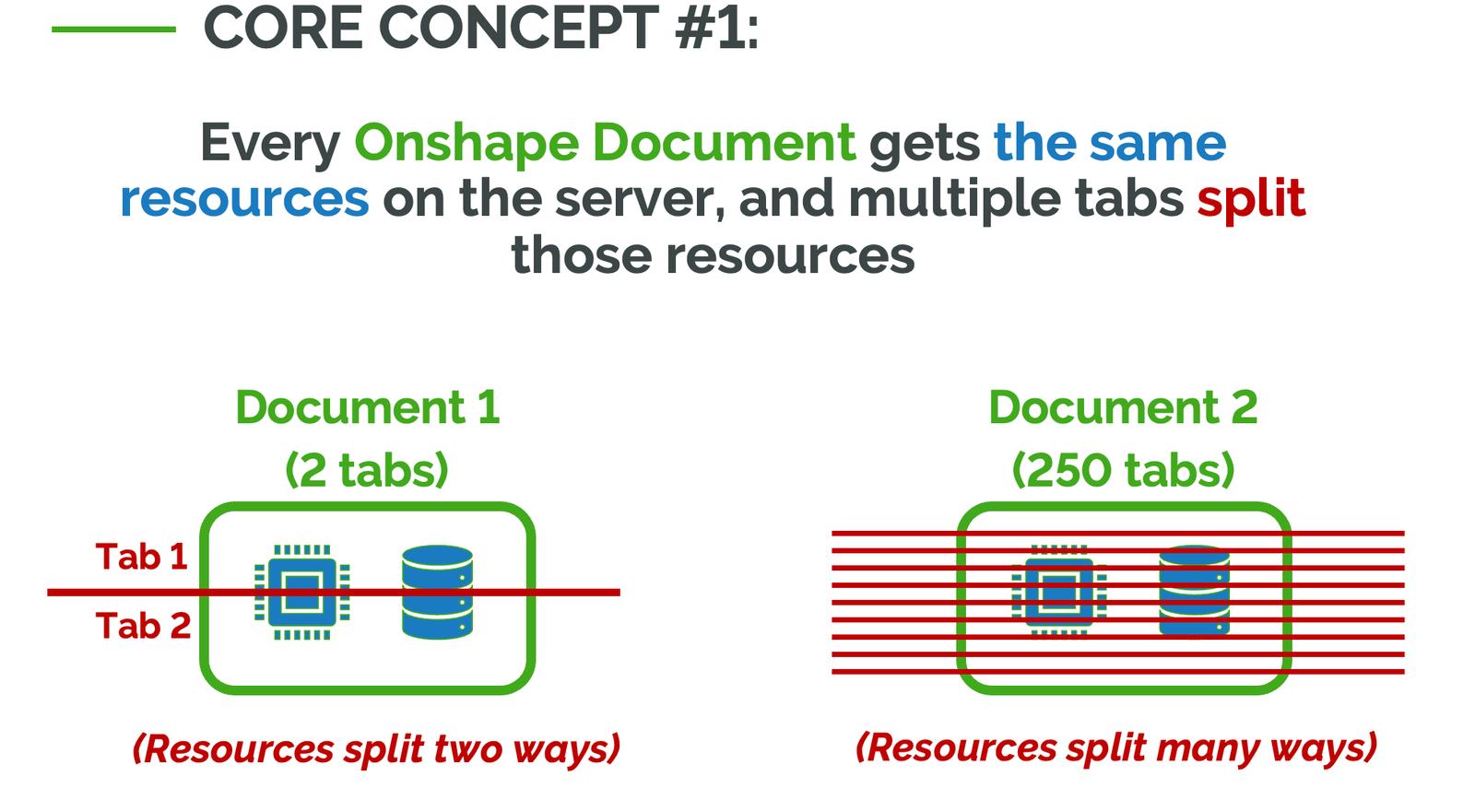 1. Every Onshape Document gets the same resources on the server, and multiple tabs split those resources.