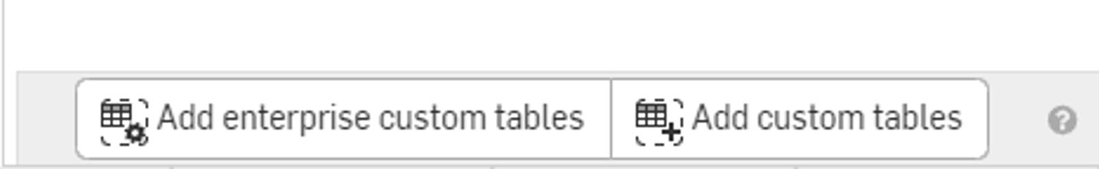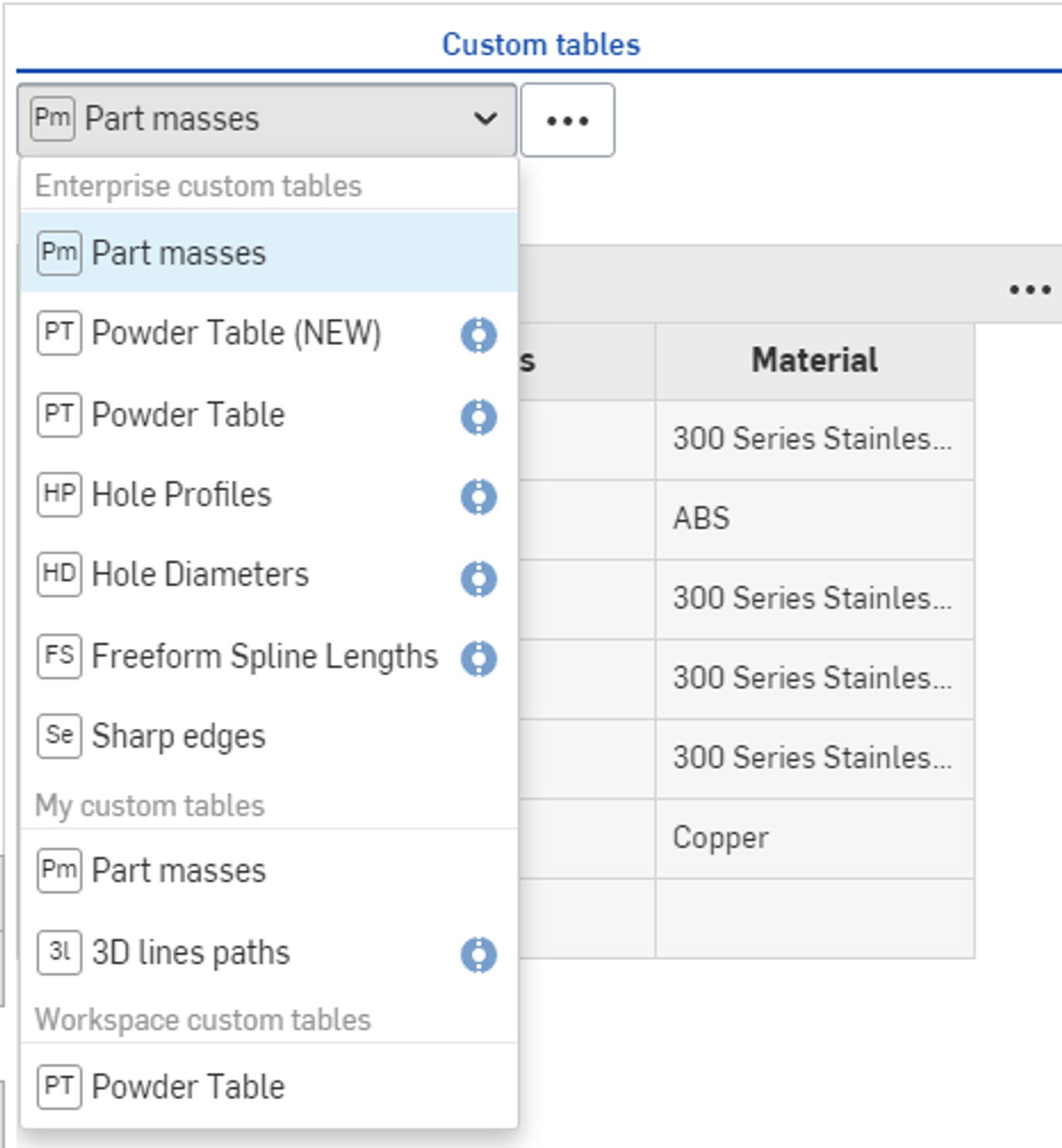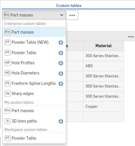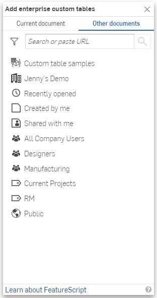 To add a Custom table for all users and open an Onshape Document. Click the Custom tables icon () to open the Custom tables panel on the right.