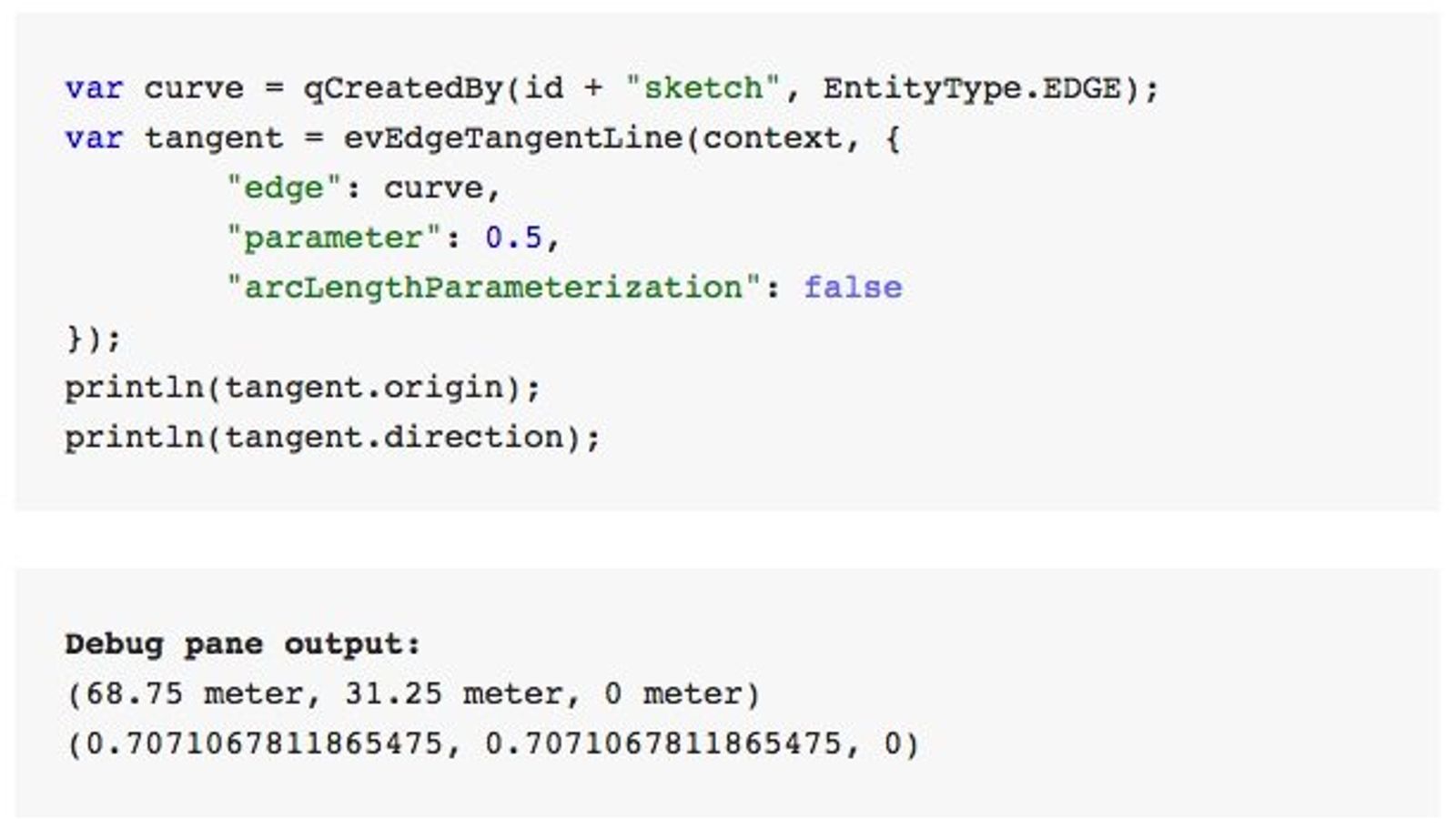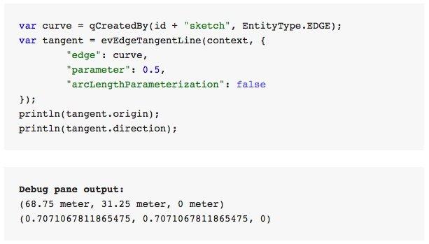 This can be useful for performing further geometry calculations after drawing a spline. For completeness, I’ll note that there is also a evEdgeTangentLines() function — which is identical but allows evaluating the curve at multiple points in one call — and an evEdgeCurvature() function — which returns not only a tangent but also normal and binormal vectors.