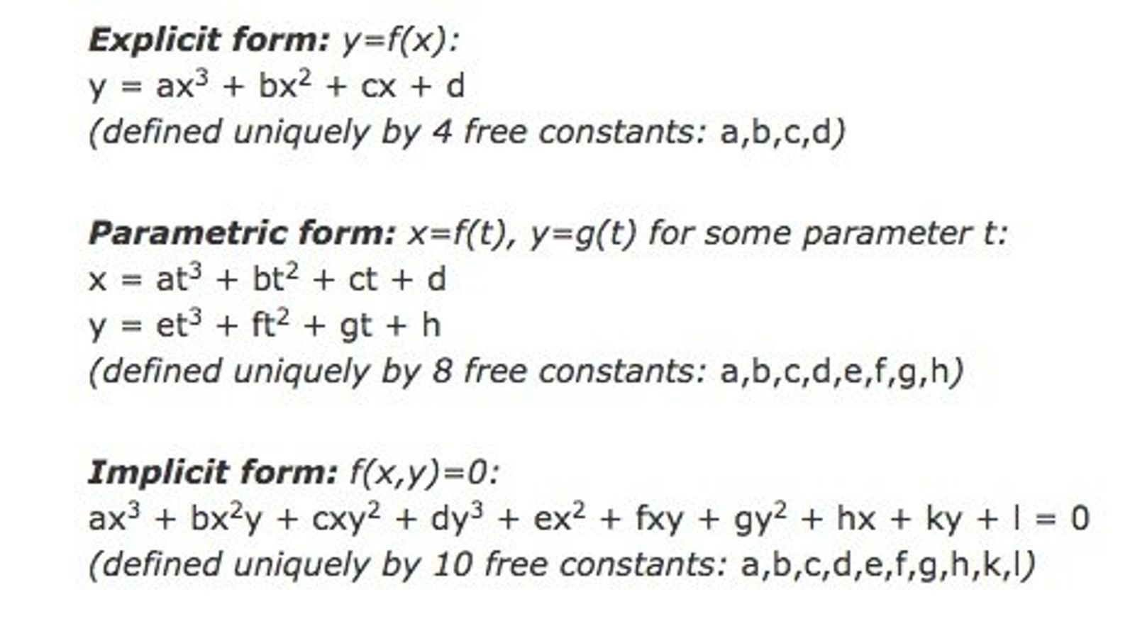 The implicit form is the most powerful – in that it can express curves that can’t be expressed in the other two forms – but it is difficult to evaluate the set of points that are part of the curve.