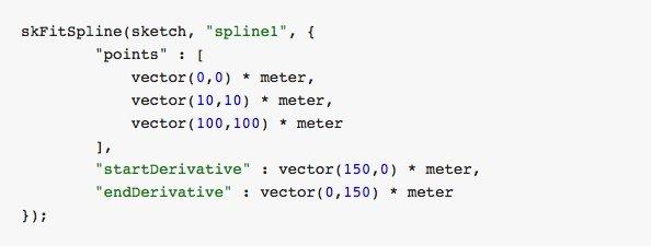 Splines can be created programmatically in an Onshape sketch using the skFitSpline() function. First, let’s start with a curve with only one polynomial piece between two points (0,0) and (100,100). In FeatureScript, we can write: