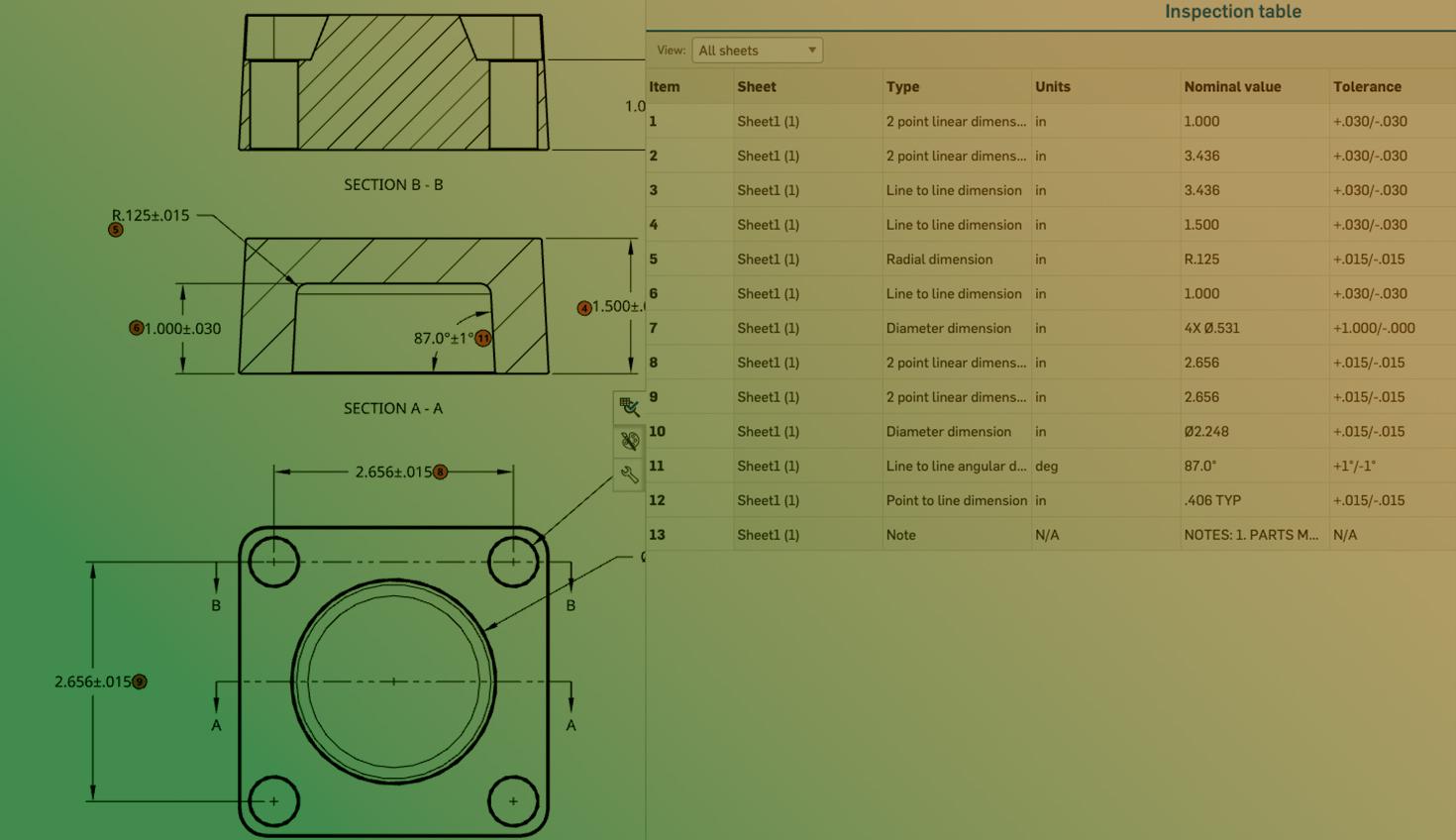 Onshape's built-in Inspection Item feature enables the First Article Inspection (FAI), significantly simplifying and automating ballooned inspection drawings and reports.