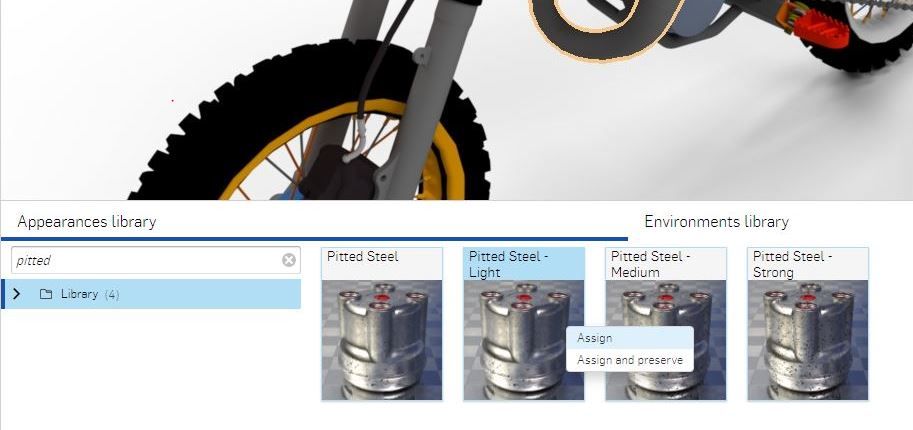 A good practice is to rename the appearances you are using to be able to find and reapply those later. As you can see in the image above, we have renamed most of the appearances we have been using to “screws”, “Rims”, “Brake Disk”.