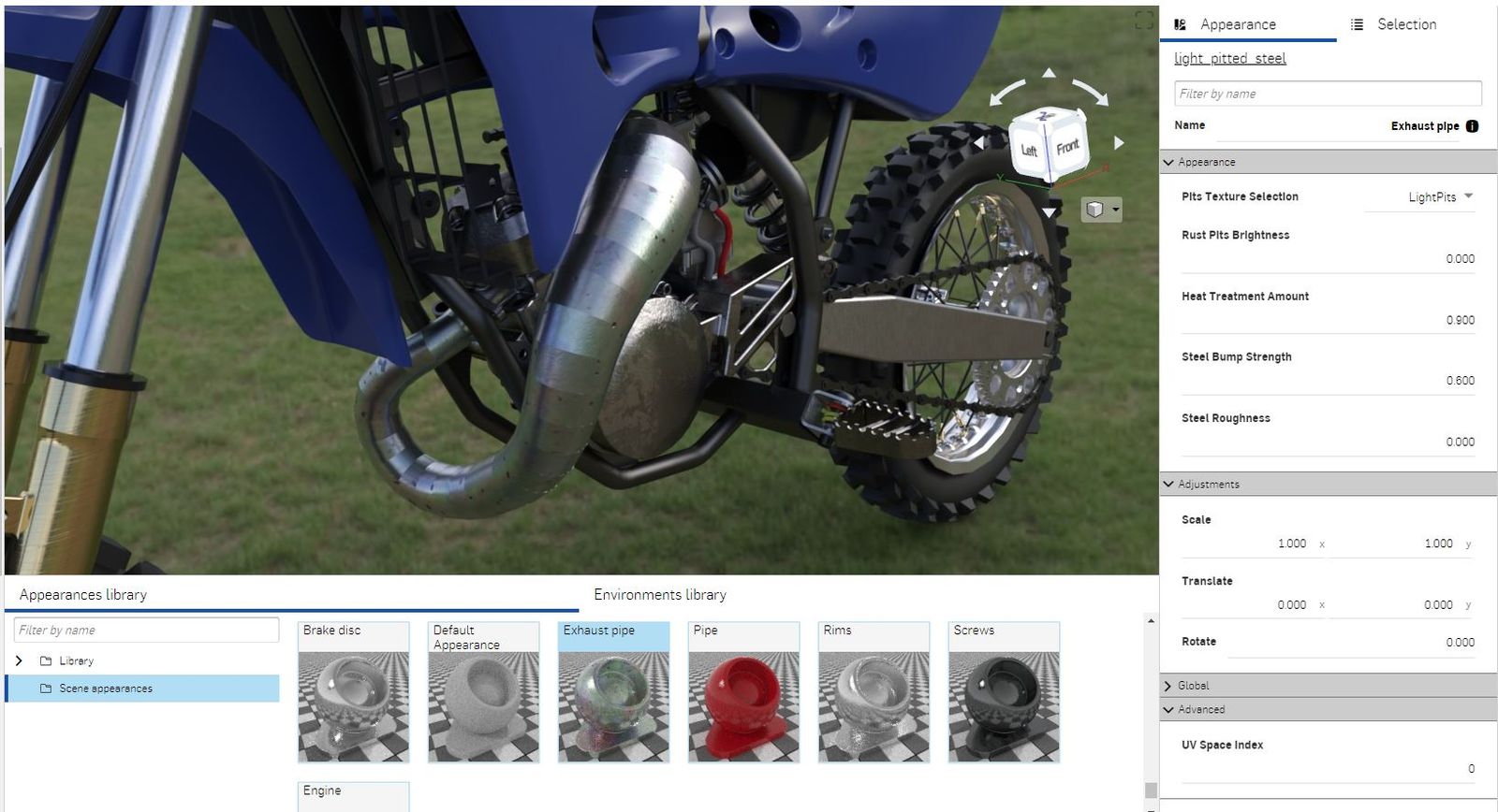Once your model has been imported, select the parts/surfaces in the scene to which you want the steel applied. Let’s select the exhaust pipe.