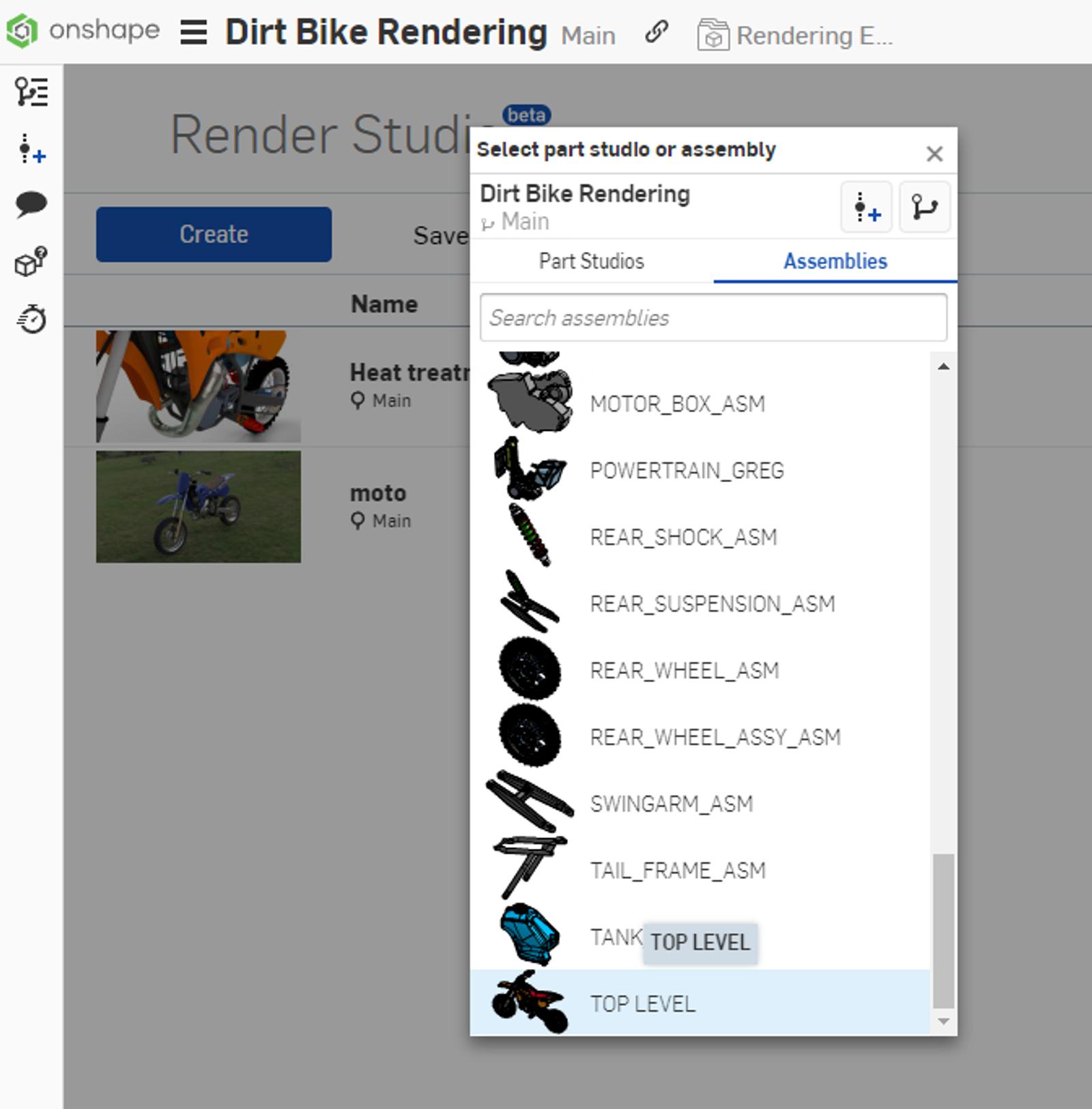 The Render Studio dashboard opens without scenes by default. Click the Create button to make your first scene and select the Part Studio or Assembly you want to render.