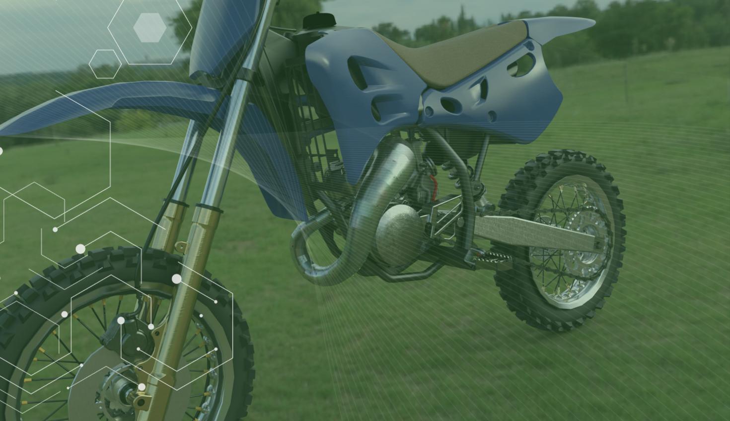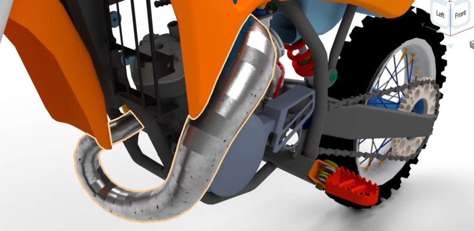 The first step is to import or build a model to which you want the heat-treated metal applied. In this example, we have imported this dirt bike model and we want to apply heat-treated steel to the exhaust pipe.