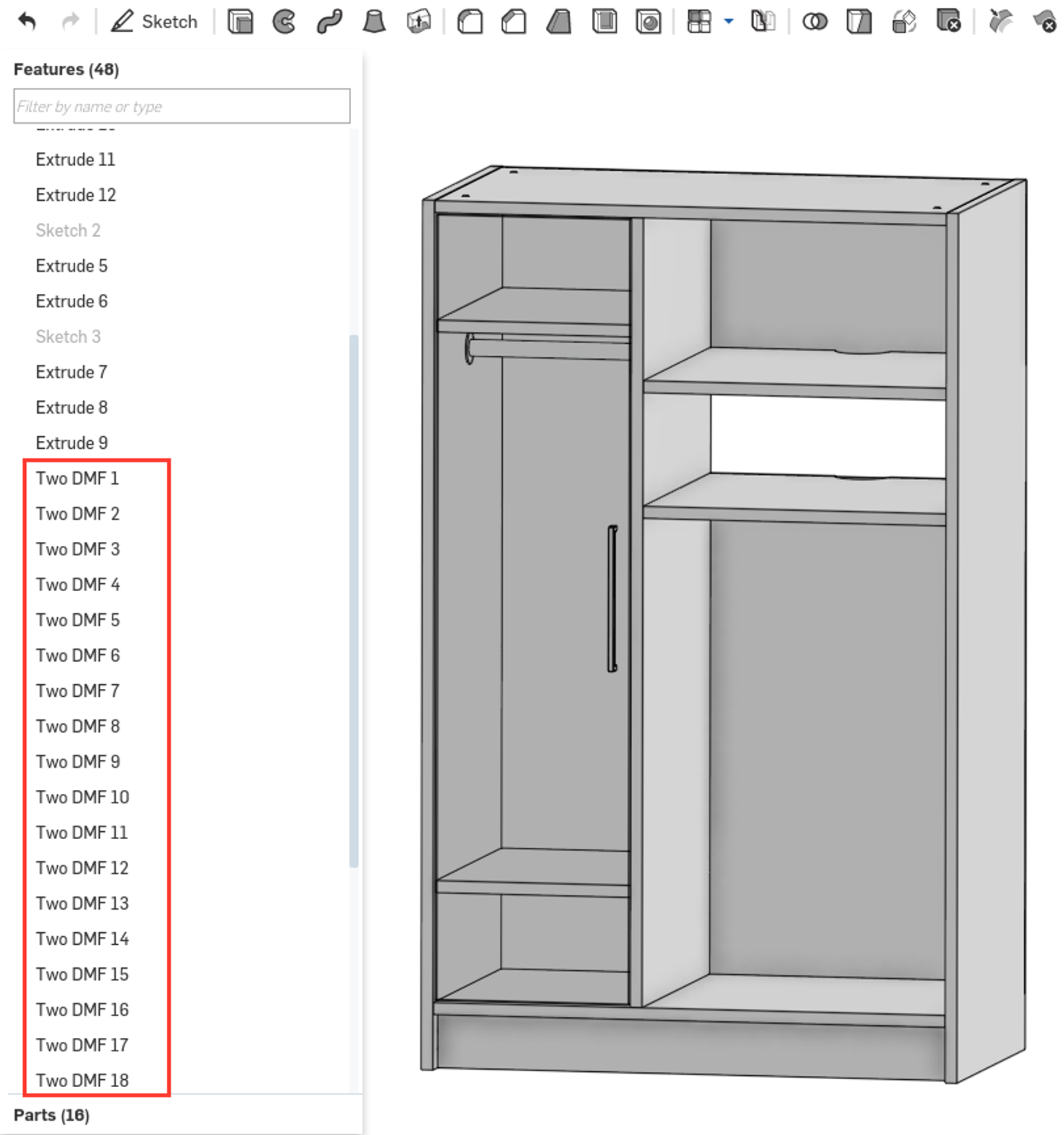 Using “Dowel/Minifix” now streamlines the process of hole placement, replacing multiple monotonous tasks with one quick feature. Take a look at this wardrobe design and how often “DMF” pops up in the feature list: