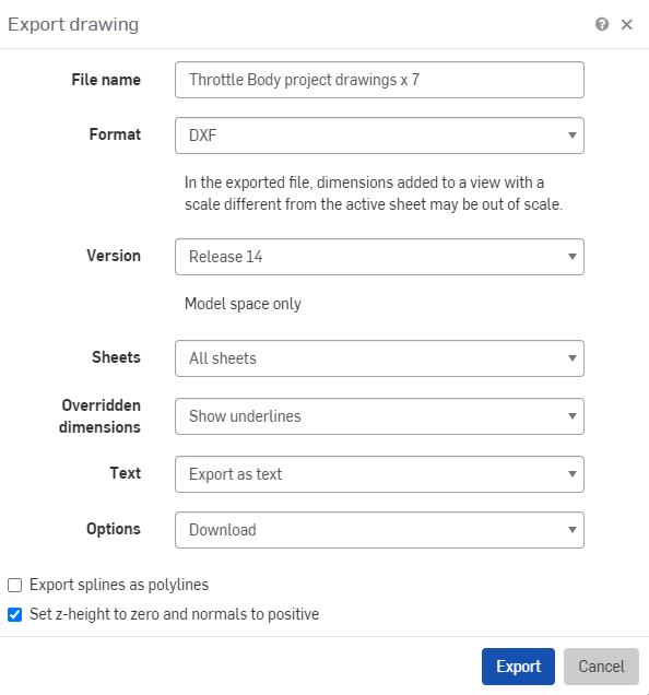 Once a design is ready to go, drawings can be exported individually in Onshape. The typical process is to simply right-click the Drawing tab you wish to export, then choose “Export” from the context menu. Then repeat the process for the rest of the Drawings.