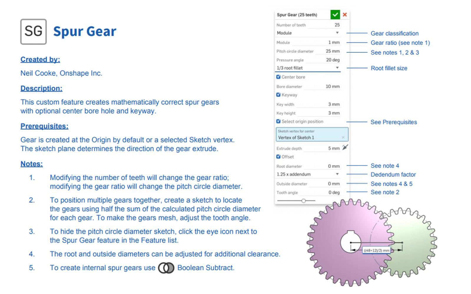 This custom feature creates mathematically correct spur gears with optional center bore hole and keyway.