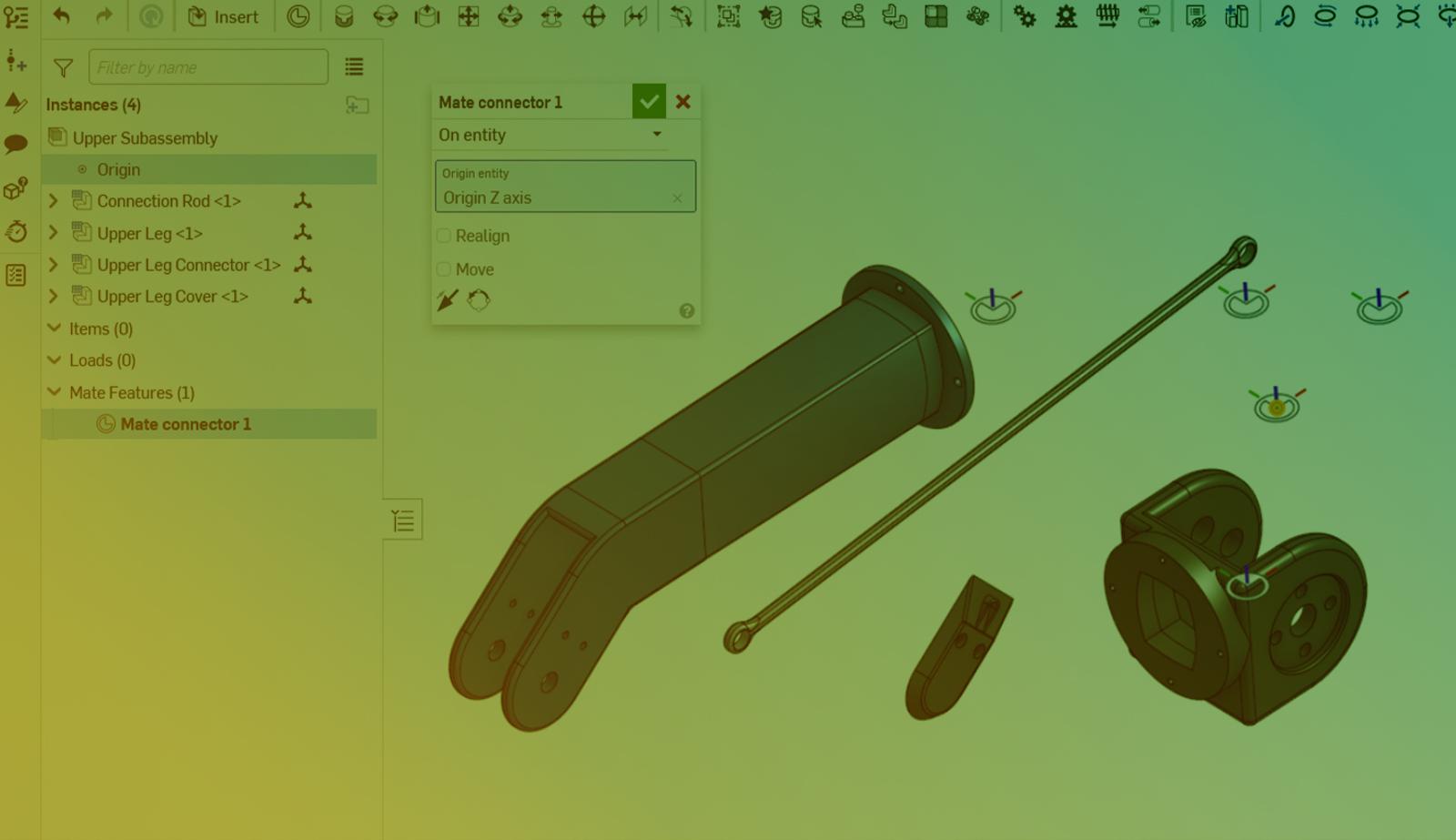 Lastly, you can create a Mate connector at an instance’s origin in an Assembly tab by right-clicking the entity in the graphics area or the Assembly list and selecting Add Mate connector to instance origin.