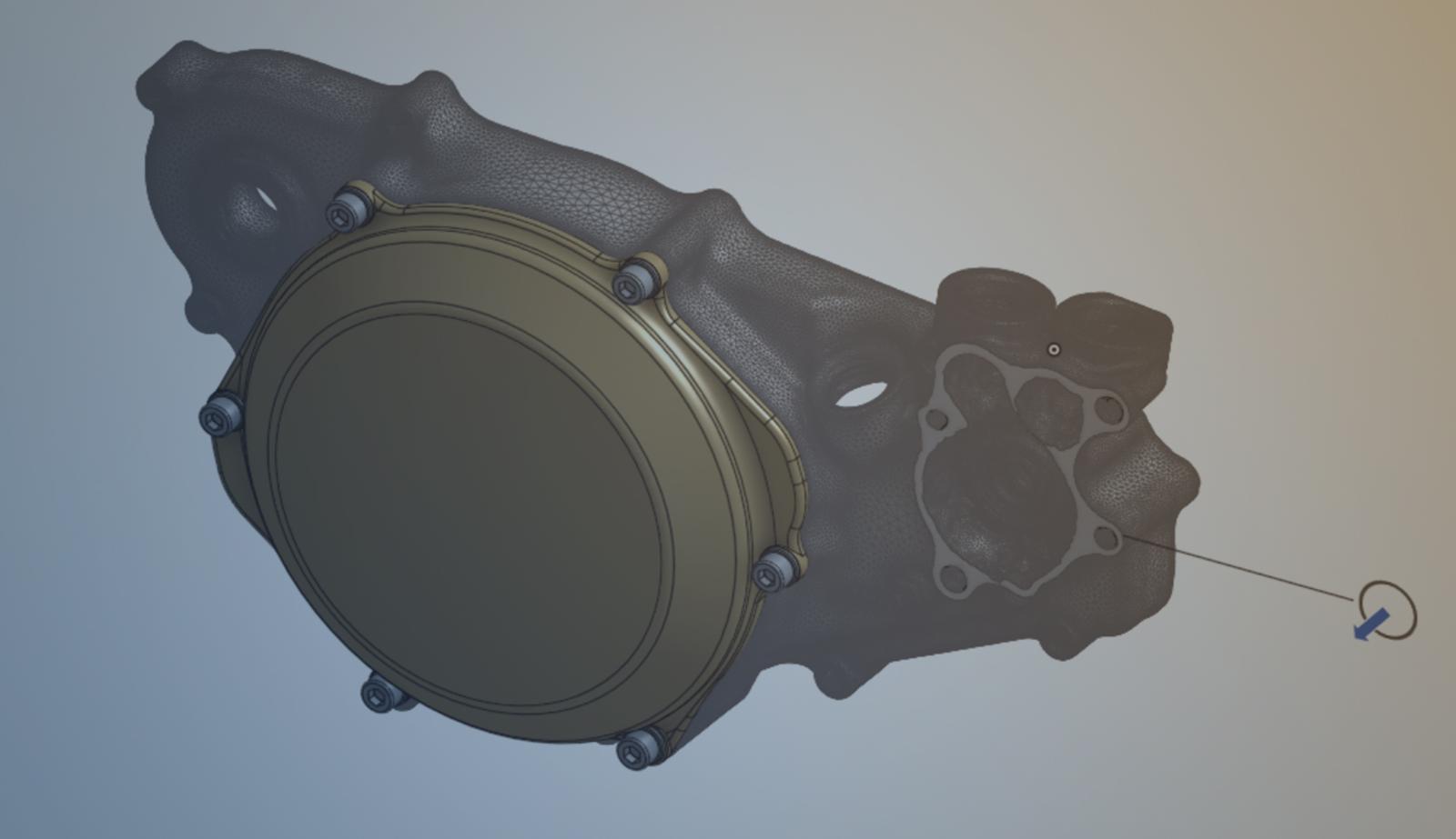 In the examples below, the face of the clutch cover can be split to reveal a flat top face on which the engine case is created. This ensures a proper fit. Mounting holes are then added. These are scoped to both the mesh and solid models.