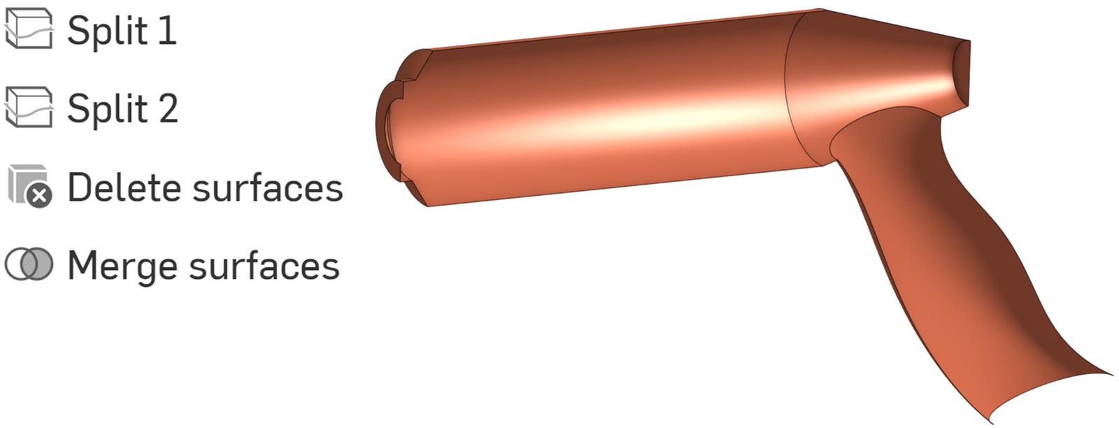 The Split Part feature is useful for splitting surfaces and removing existing surfaces used for the splitting operation.