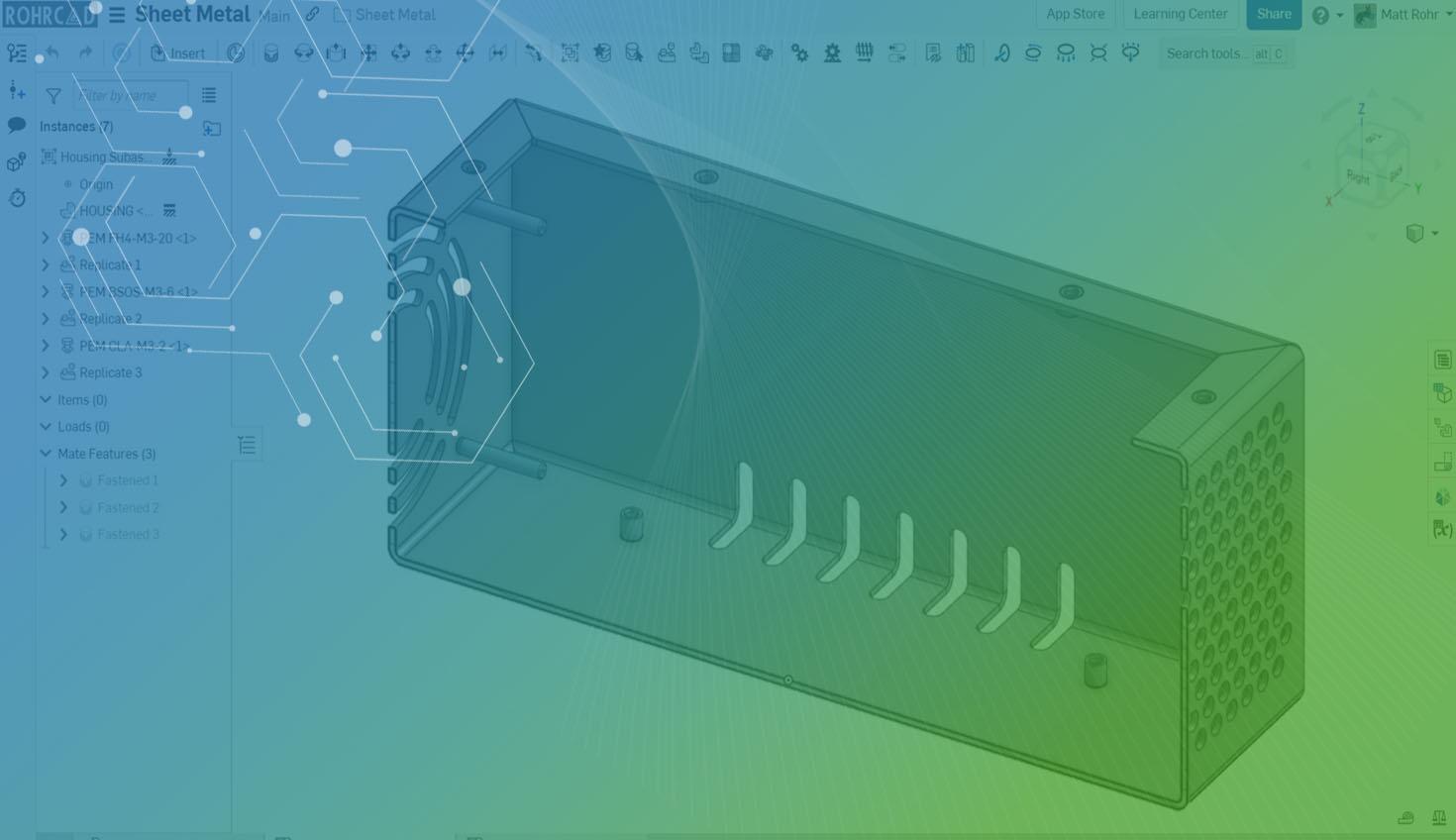 Onshape fundamentally improves sheet metal design workflows by letting you update the folded, flat, and table views simultaneously, preventing the creation of parts that cannot be flattened. Additionally, multi-part Part Studios allow sharing and referencing geometry between the sheet metal and mating parts to ensure proper fits.