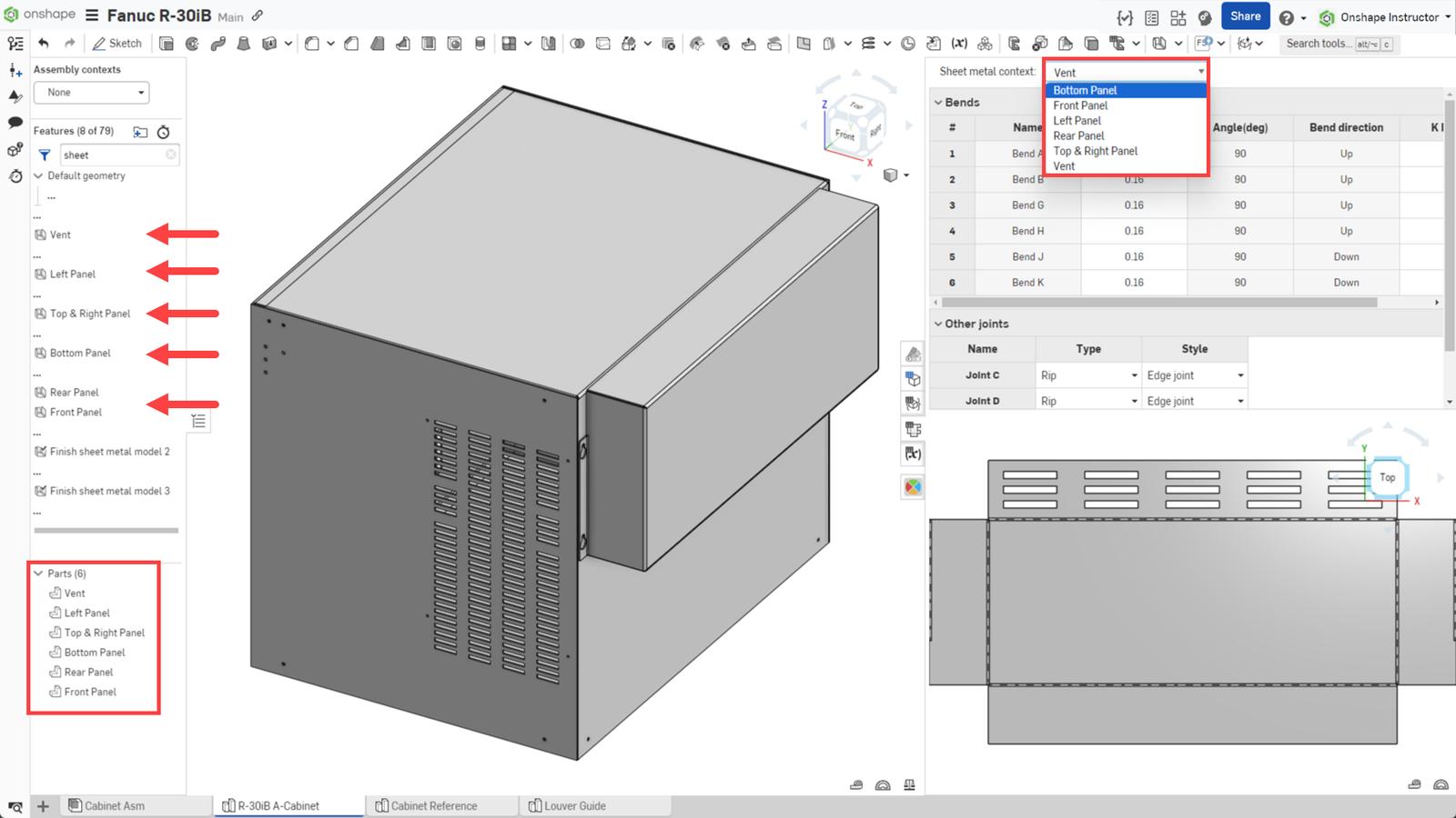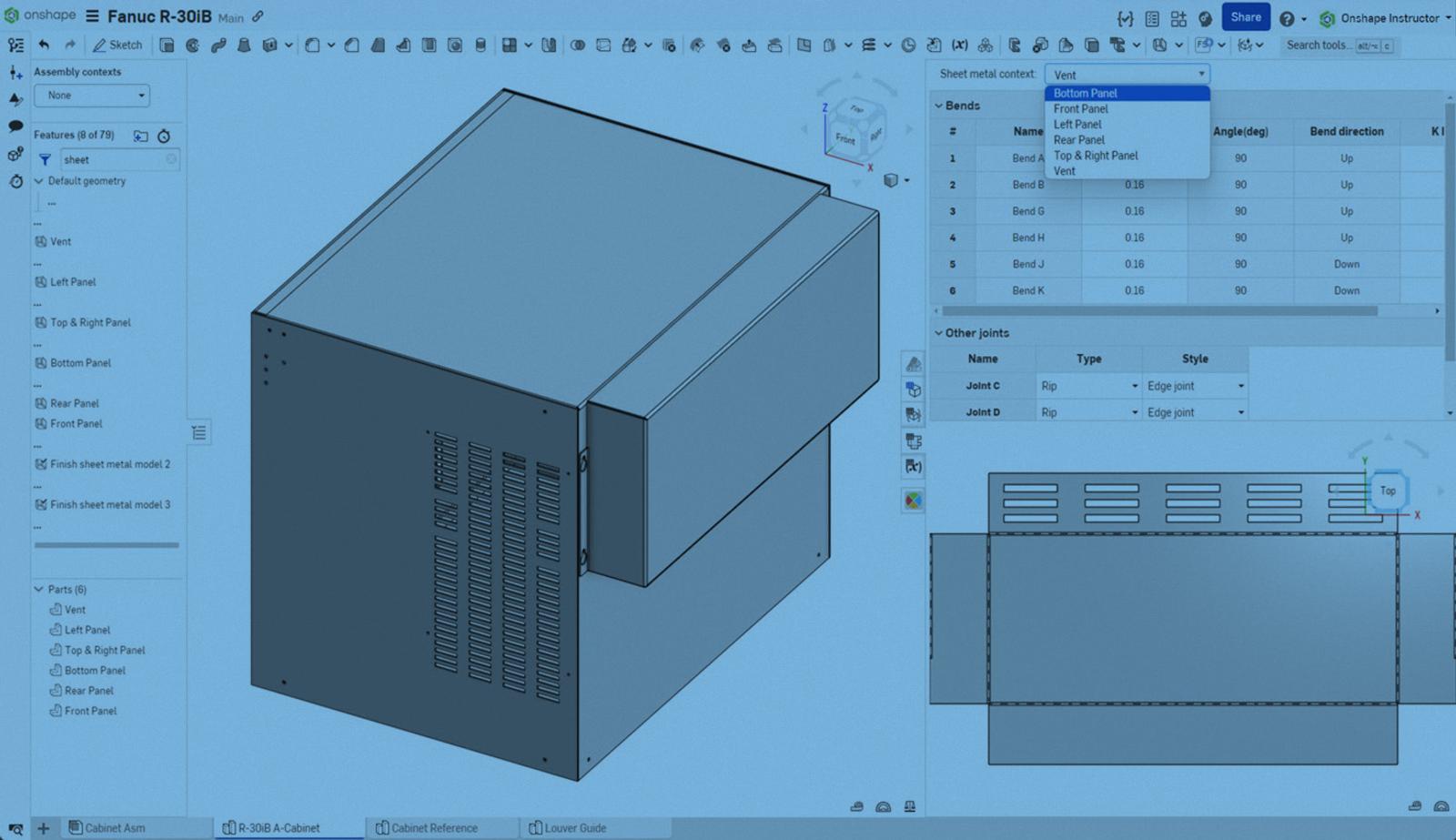 One benefit of an Onshape Part Studio is the ability to create multiple interrelated parts within one environment. The same holds true for sheet metal part design.