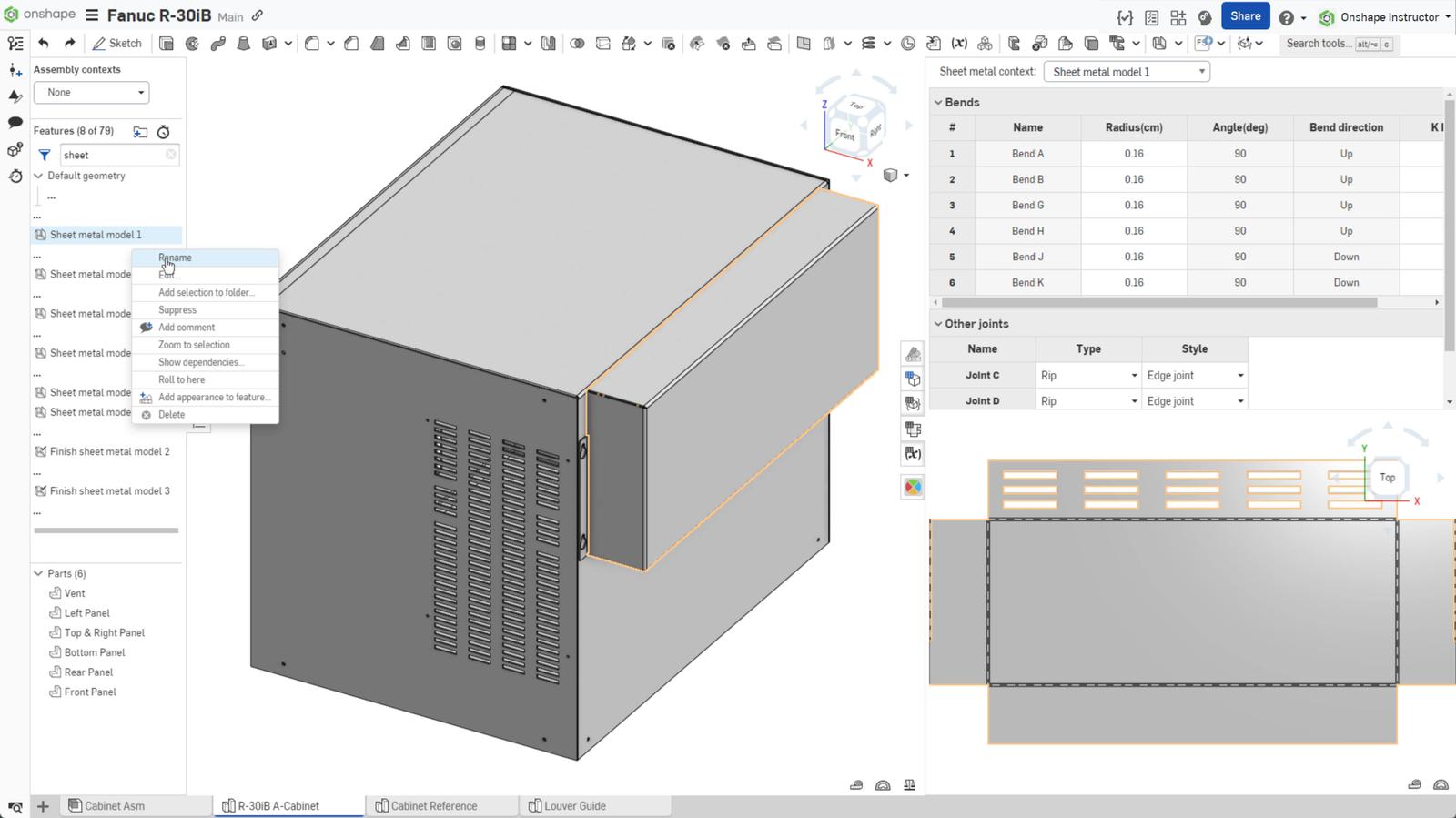 This Tech Tip helped you learn how to rename multiple Sheet metal contexts. We have more resources for you to learn about related features, like sheet metal design. See the Simultaneous Sheet Metal self-paced course in the Onshape Learning Center.