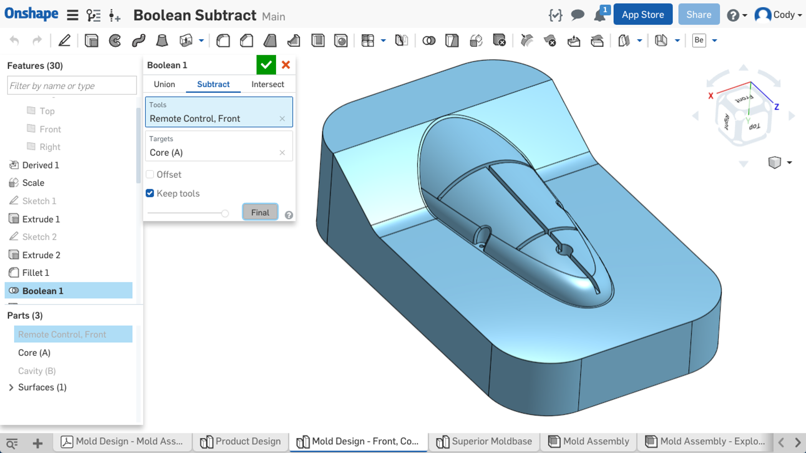 The second boolean option, “Subtract,” allows you to subtract a part or parts from another one. This is a common technique in many different industries, such as mold making, where the first step in the process of creating a mold is subtracting a finished part from a cavity or core.