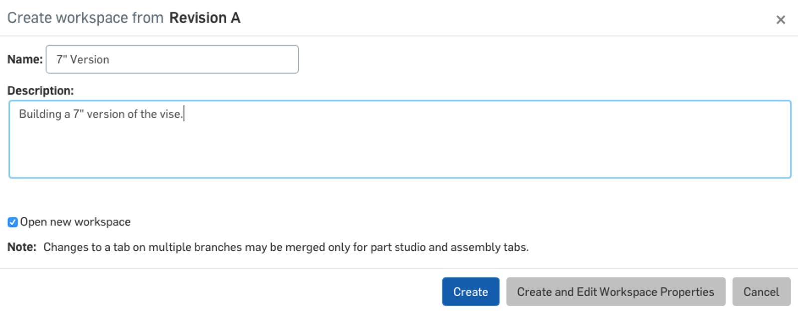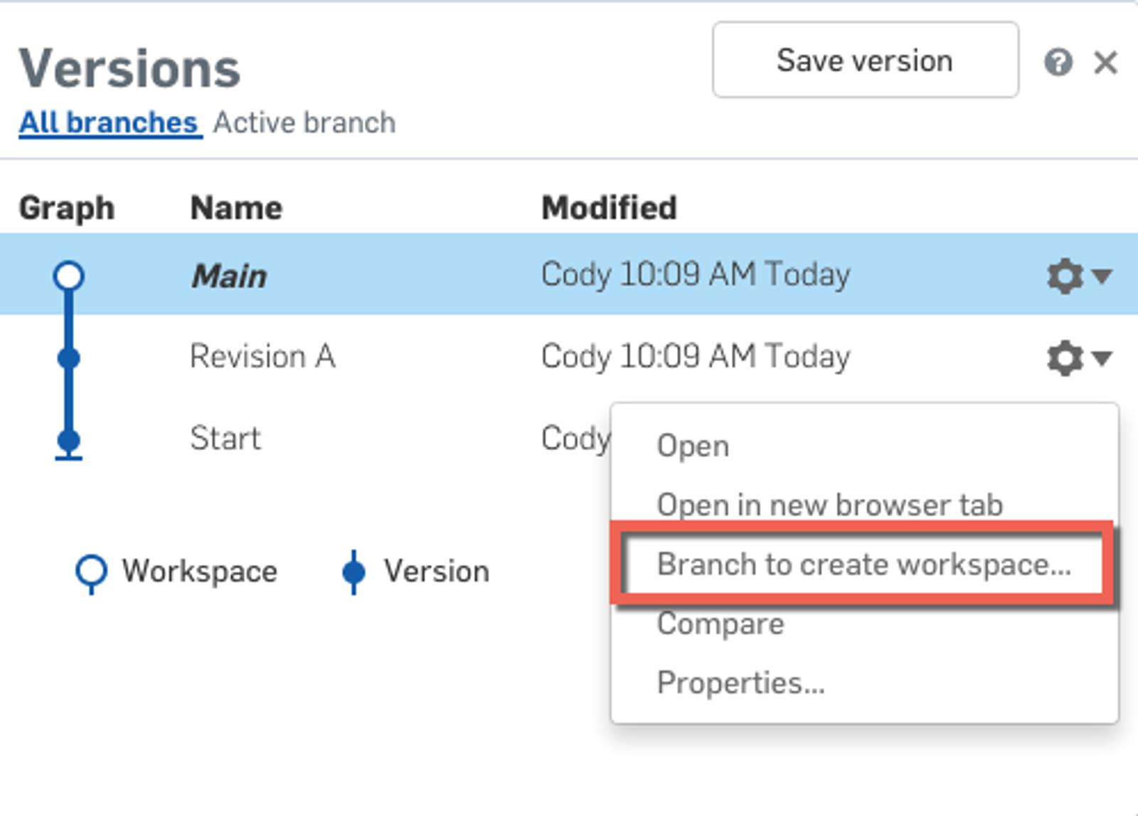 Now that we have an established version, we can select the “Branch to create workspace” command from the gear dropdown menu in the Version Manager.
