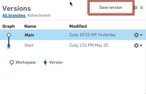 The first step in creating a branch is establishing a version. From the Version Manager, select “Save Version.” Here you can type in the name of the version and click “Save.”