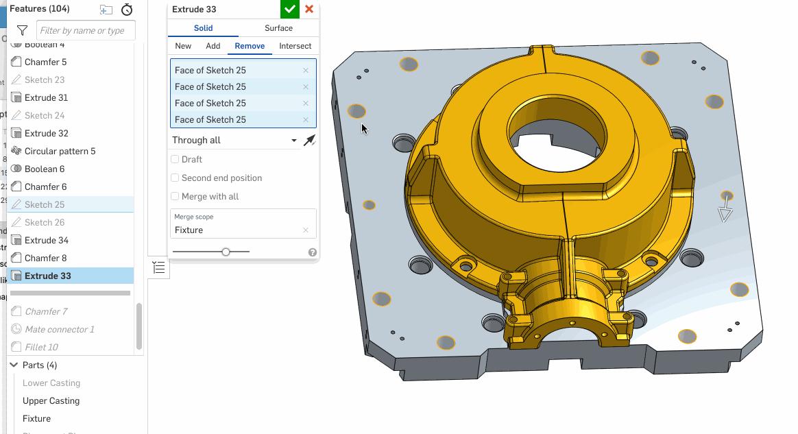 An example of this behavior is shown below. You need to remove one of the holes from the Extrude in the fixture. If you try to select or deselect a sketch region while the sketch is hidden, it instead tries to select the face. Once the sketch is shown, select the hole and it’s removed from the feature.