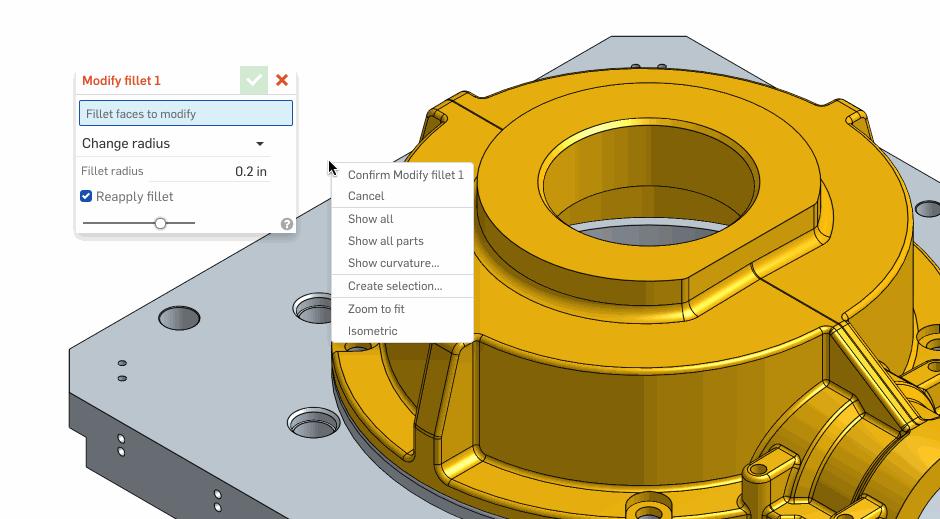 When you need to select many faces or edges at a time, the Create Selection tool can be really helpful. The fillets on the casting (yellow) need to be modified, but it is an imported part, so there is no feature to edit. Instead, Modify Fillet combined with Create Selection easily allows you to modify them. For more detailed information on Create Selection, refer to last week’s Tech Tip.
